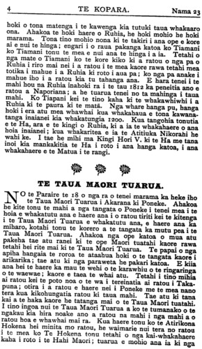 hoki o tona matenga i te kawenga kia tutuki taua whakaaro ona. Ahakoa te hoki haere o Ruhia, he hoki mohio he hoki marama. Tona tino mohio nona ki te takiri i ana ope e kore ai e nui te hinga; engari i o raua pakanga katoa ko Tiamani ko Tiamani tonu te mea e nui ana te hinga i a ia. Tetahi o nga mate o Tiamani ko te kore kiko ki a ratou o nga pa o Ruhia i riro mai nei i a ratou i te mea kaore rawa tetahi mea totika i mahue i a Ruhia ki roto i aua pa; ko nga pa anake i mahue iho i a ratou kia tu tahanga ana. E hara tenei i te mahi hou na Ruhia inahoki ra i te tau 1812 ka peneitia ano e ratou a Naporiana; a he tuarua tenei no ta mahinga i taua mahi. Ko Tiapani kei te tino kaha ki te whakawhiwhi i a Ruhia ki te paura ki te mata. Nga whare hanga pu, hanga hoki i era atu mea whawhai kua whakahaua e tona kawanatanga inaianei kia whakatungia 1200. Kua tangohia tonutia e te Ha, ara e te kingi o Ruhia, ki a ia te whakahaere o ana hoia inaianei; kua whakaritea e ia te Atitiuka Nikorahi he wahi ke. I tae he mihi ma Kingi Hori V. ki te Ha me tana inoi kia mankakitia te Ha i roto i ana hanga katoa, i ana whakahaere e te Matua i te rangi. TE TAUA MAORI TUARUA. NO te Paraire te 18 o nga ra o tenei marama ka heke iho te Taua Maori Tuarua i Akarana ki Poneke. Ahakoa he kite tonu te mahi a nga tangata o Poneke i tenei mea i te hoia e whakatutu ana e haere ana i o ratou tiriti kei te kitenga i te Taua Maori Tuarua e whakatutu ana, e haere ana ka miharo, kotahi tonu te korero a te tangata ka mutu pea i te Taua Maori Tuarua. Ahakoa nga ope katoa o mua atu pakeha tae atu ranei ki te ope Maori tuatahi kaore rawa tetahi hei rite mai ki te Taua Maori Tuarua. Te papai o nga apiha hangaia te roroa te ataahua hoki o te tangata kaore i arikarika; tae atu ki nga paraweta he pakari katoa. E kiia ana hei te haere ka mau te wehi o te karawhiu o te ringariga o te waewae; kaore e taea te whai atu. Tetahi i tino mihia ai ratou kei te poto noa o te wa i tereinatia ai ratou i Takapuna; otira i a ratou e haere nei i Poneke me te mea nano tera kua kikohungatia ratou ki taua mahi. Tae atu ki tana kai a te haka kaore he tatanga mai o te Taua Maori tuatahi. I tino ingoa nui te Taua Maori Tuarua a ko te tumanako o to ngakau kia hira noake ano a ratou na mahi i nga mahi a o ratou hoa e whawhai mai ra. Kua haere tonu ko te Atirikona Hokena hei minita mo ratou, he waimarie nui tera no ratou i te mea ko Te Hokena tonu tetahi o nga kai-whakahaere kaha i roto i te Hahi Maori; tuarua e mohio ana ia ki nga.