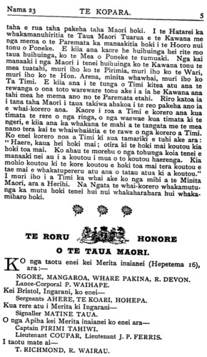 TE RORU HONORE O TE TAUA MAORI. KO nga taotu enei kei Merita inaianei (Hepetema 16), ara: NGORE, MANGAROA, WHARE PAKINA, R. DEVON. Lance-Corporal P. WAIHAPE. Kei Bristol, Ingarani, ko enei Sergeants AHERE, TE KOARI, HOHEPA. Kua rere atu i Merita ki Ingarani Signaller MATINE TAUA. O nga Apiha kei Merita inaianei ko enei ara Captain PIRIMI TAHIWI. Lieutenant COUPAR, Lieutenant J. P. FERRIS. I taotu mate ai T. RICHMOND, R. WAIRAU.