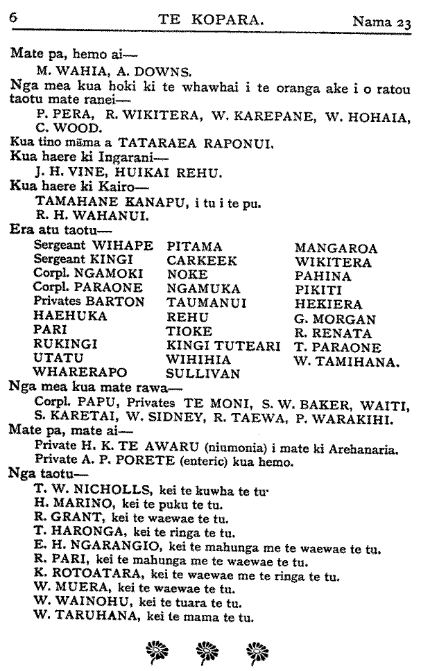 Mate pa, hemo ai M. WAHIA, A. DOWNS. Nga mea kua hoki ki te whawhai i te oranga ake i o ratou taotu mate ranei P. PERA, R. WIKITERA, W. KAREPANE, W. HOHAIA, C. WOOD. Kua tino mama a TATARAEA RAPONUI. Kua haere ki Ingarani J. H. VINE, HUIKAI REHU. Kua haere ki Kairo TAMAHANE KANAPU, i tu i te pu. R. H. WAHANUI. Era atu taotu Sergeant WIHAPE PITAMA MANGAROA Sergeant KINGI CARKEEK WIKITERA Corpl. NGAMOKI NOKE PAHINA Corpl. PARAONE NGAMUKA PIKITI Privates BARTON TAUMANUI HEKIERA HAEHUKA REHU G. MORGAN PARI TIOKE R. RENATA RUKINGI KINGI TUTEARI T. PARAONE UTATU WIHIHIA W. TAMIHANA. WHARERAPO SULLIVAN Nga mea kua mate rawa Corpl. PAPU, Privates TE MONI, S. W. BAKER, WAITI, S. KARETAI, W. SIDNEY, R. TAEWA, P. WARAKIHI. Mate pa, mate ai Private H. K. TE AWARU (niumonia) i mate ki Arehanaria. Private A. P. PORETE (enteric) kua hemo. Nga taotu T. W. NICHOLLS, kei te kuwha te tu H. MARINO, kei te puku te tu. R. GRANT, kei te waewae te tu. T. HARONGA, kei te ringa te tu. E. H. NGARANGIO, kei te mahunga me te waewae te tu. R. PARI, kei te mahunga me te waewae te tu. K. ROTOATARA, kei te waewae me te ringa te tu. W. MUERA, kei te waewae te tu. W. WAINOHU, kei te tuara te tu. W. TARUHANA, kei te mama te tu.