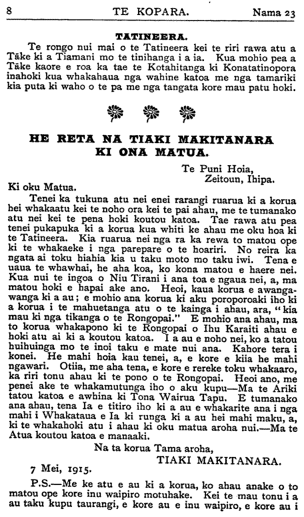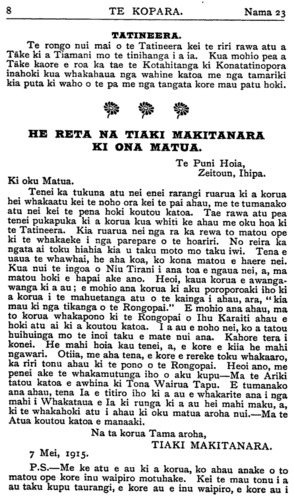 TATINEERA. Te rongo nui mai o te Tatineera kei te riri rawa atu a Take ki a Tiamani mo te tinihanga i a ia. Kua mohio pea a Take kaore e roa ka tae te Kotahitanga ki Konatatinopora inahoki kua whakahaua nga wahine katoa me nga tamariki kia puta ki waho o te pa me nga tangata kore mau patu hoki. HE RETA NA TIAKI MAKITANARA KI ONA MATUA. Te Puni Hoia, Zeitoun, Ihipa. Ki oku Matua. Tenei ka tukuna atu nei enei rarangi ruarua ki a korua hei whakaatu kei te noho ora kei te pai ahau, me te tumanako atu nei kei te pena hoki koutou katoa. Tae rawa atu pea tenei pukapuka ki a korua kua whiti ke ahau me oku hoa ki te Tatineera. Kia ruarua nei nga ra ka rewa to matou ope ki te whakaeke i nga parepare o te hoariri. No reira ka ngata ai toku hiahia kia u taku moto mo taku iwi. Tena e uaua te whawhai, he aha koa, ko kona matou e haere nei. Kua nui te ingoa o Niu Tirani i ana toa e ngaua nei, a, ma matou hoki e hapai ake ano. Heoi, kaua korua e awangawanga ki a au; e mohio ana korua ki aku poroporoaki iho ki a korua i te mahuetanga atu o te kainga i ahau, ara, "kia mau ki nga tikanga o te Rongopai." E mohio ana ahau, ma to korua whakapono ki te Rongopai o Ihu Karaiti ahau e hoki atu ai ki a koutou katoa. I a au e noho nei, ko a tatou huihuinga mo te inoi taku e mate nui ana. Kahore tera i konei. He mahi hoia kau tenei, a, e kore e kiia he mahi ngawari. Otiia, me aha tena, e kore e rereke toku whakaaro, ka riri tonu ahau ki te pono o te Rongopai. Heoi ano, me penei ake te whakamutunga iho o aku kupu. Ma te Ariki tatou katoa e awhina ki Tona Wairua Tapu. E tumanako ana ahau, tena Ia e titiro iho ki a au e whakarite ana i nga mahi i Whakataua e Ia ki runga ki a au hei mahi maku, a, ki te whakahoki atu i ahau ki oku matua aroha nui. - Ma te Atua koutou katoa e manaaki. Na ta korua Tama aroha, TIAKI MAKITANARA. 7 Mei, 1915 P.S. - Me ke atu e au ki a korua, ko ahau anake o to matou ope kore inu waipiro motuhake. Kei te mau tonu i a au taku kupu taurangi, e kore au e inu waipiro, e kore au i