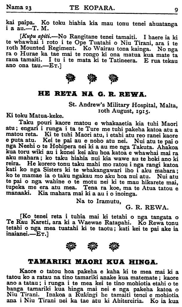 kai paipa. Ko toku hiahia kia mau tonu tenei ahuatanga i a au. T. M. [Kupu apiti. - No Rangitane tenei tamaiti. I haere ia ki te whawhai i roto i te Ope Tuatahi o Niu Tirani, ara i te 10th Mounted Regiment. Ko Wairau tona kainga. No nga ra o Hurae ka tae mai te rongo ki ona matua kua mate ta raua tamaiti. I tu i te mata ki te Tatineera. E rua tekau ano ona tau. - ET.] HE RETA NA G. R. REWA. St. Andrew's Military Hospital, Malta, 10th August, 1915. Ki toku Matua-keke. Taku pouri kaore matou e whakaaetia kia tuhi Maori atu; engari i runga i ta te Ture me tuhi pakeha katoa atu a matou reta. Ki te tuhi Maori atu, i etahi atu reo ranei kaore e puta atu. Kei te pai au e noho atu nei. Nui atu te pai o nga Neehi o te Hohipera nei ki a au me nga Takuta. Ahakoa kua toru wiki au i konei kei aku hoa katoa e whawhai mai ra aku mahara; ko taku hiahia nui kia wawe au te hoki ano ki reira. He korero tonu taku mahi mo ratou i nga rangi katoa kati ko nga Sisters ki te whakangawari iho i aku mahara; ko te mamae ia o taku ngakau mo aku hoa nui atu. Nui atu te pai o nga wahine o te motu nei ki te mau hikarete mai, tupeka me era atu mea. Tena ra koe, ma te Atua tatou e manaaki. Kia mahara mai ki a au i o inoinga. Na to Iramutu, G. R. REWA. [Ko tenei reta i tuhia mai ki tetahi o nga tangata o Te Rau Kareti, ara ki a Waewae Ratapahi. Ko Rewa tonu tetahi o nga mea tuatahi ki te taotu; kati kei te pai ake ia inaianei. - ET.] TAMARIKI MAORI KUA HINGA. Kaore o tatou hoa pakeha e kaha ki te mea mai ki a tatou ko a ratau na tino tamariki anake kua matemate; kaore ano a tatau; i runga i te mea kei te tino mohiotia etahi o te hanga tamariki kua hinga mai nei e nga pakeha katoa o Niu Tirani. Inakoa a Rukingi he tamaiti tenei e mohiotia ana i Niu Tirani nei ka tae atu ki Ahitereiria. Ko ia kua