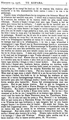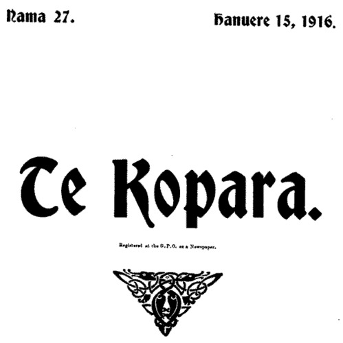 Nama 27. Hanuere 15, 1916. Te Kopara. Registred at the G.P.O. as a Newspaper. Te Oranga mo tenei Pepa e Rima Hereni mo te Tau.