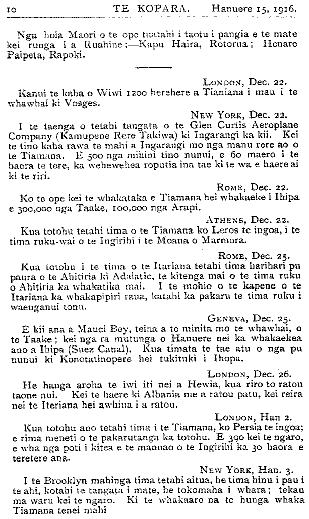 Nga hoia Maori o te ope tuatahi i taotu i pangia e te mate kei runga i a Ruahine: - Kapu Haira, Rotorua; Henare Paipeta, Rapoki. LONDON, Dec. 22. Kanui te kaha o Wiwi 1200 herehere a Tianiana i mau i te whawhai ki Vosges. NEW YORK, Dec. 22. I te taenga o tetahi tangata o te Glen Curtis Aeroplane Company (Kamupene Rere Takiwa) ki Ingarangi ka kii. Kei te tino kaha rawa te mahi a Ingarangi mo nga manu rere ao o te Tiamana. E 500 nga mihini tino nunui, e 60 maero i te haora te tere, ka wehewehea roputia ina tae ki te wa e haere ai ki te riri. ROME, Dec. 22. Ko te ope kei te whakataka e Tiamana hei whakaeke i Ihipa e 300,000 nga Taake, 100,000 nga Arapi. ATHENAS, Dec. 22. Kua totohu tetahi tima o te Tiamana ko Leros te ingoa, i te tima rukuwai o te Ingirihi i te Moana o Marmora. ROME, Dec. 25. Kua totohu i te tima o te Itariana tetahi tima harihari pu paura o te Ahitiria ki Adaiatic, te kitenga mai o te tima ruku o Ahitiria ka whakatika mai. I te mohio o te kapene o te Itariana ka whakapipiri raua, katahi ka pakaru te tima ruku i waenganui tonu. GENEVA, Dec. 25. E kii ana a Mauci Bey, teina a te minita mo te whawhai, o te Taake; kei nga ra mutunga o Hanuere nei ka whakaekea ano a Ihipa (Suez Canal), Kua timata te tae atu o nga pu nunui ki Konotatinopere hei tukituki i Ihopa. LONDON, Dec. 26. He hanga aroha te iwi iti nei a Hewia, kua riro to ratou taone nui. Kei te haere ki Albania me a ratou patu, kei reira nei te Iteriana hei awhina i a ratou. LONDON, Han 2. Kua totohu ano tetahi tima i te Tiamana, ko Persia te ingoa; e rima meneti o te pakarutanga ka totohu. E 390 kei te ngaro, e wha nga poti i kitea e te manuao o te Ingirihi ka 30 haora e teretere ana. NEW YORK, Han. 3. I te Brooklyn mahinga tima tetahi aitua, he tima hinu i pau i te ahi, kotahi te tangata i mate, he tokomaha i whara; tekau ma waru kei te ngaro. Ki te whakaaro na te hunga whaka Tiamana tenei