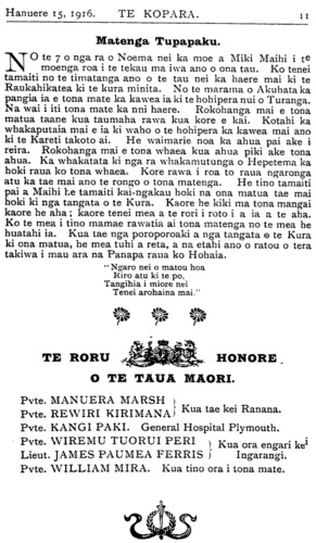 mahi. Matenga Tupapaku. NO te 7 o nga ra o Noema nei ka moe a Miki Maihi i te moenga roa i te tekau ma iwa ano o ona tau. Ko tenei tamaiti no te timatanga ano o te tau nei ka haere mai ki te Raukahikatea ki te kura minita. No te marama o Akuhata ka pangia ia e tona mate ka kawea ia ki te hohipera nui o Turanga. Na wai i iti tona mate ka nui haere. Rokohanga mai e tona matua taane kua taumaha rawa kua kore e kai. Kotahi ka whakaputaia mai e ia ki waho o te hohipera ka kawa mai ano ki te Kareti takoto ai. He waimarie noa ka ahua pai ake i reira. Rokohanga mai e tona whaea kua ahua piki ake tona ahua. Ka whakatata ki nga ra whakamutunga o Hepetema ka hoki raua ko tona whaea. Kore rawa i roa to raua ngaronga atu ka tae mai ano te rongo o tona matenga. He tino tamaiti pai a Maihi he tamaiti kai-ngakau hoki na ona matua tae mai hoki ki nga tangata o te Kura. Kaore he kiki ma tona mangai kaore he aha; kaore tenei mea a te rori i roto i a ia a te aha. Ko te mea i tino mamae rawatia ai tona matenga no te mea he huatahi ia. Kua tae nga poroporoaki a nga tangata o te Kura ki ona matua, he mea tuhi a reta, a na etahi ano o ratou o tera takiwa i mau ara na Panapa raua ko Hohaia. "Ngaro nei o matou hoa Riro atu ki te po. Tangihia i miore nei Tenei arohaina mai." TE RORU HONORE O TE TAUA MAORI. Pvte. MANUERA MARSH Kua tae kei Ranana. Pvte. REWIRI KIRIMANA Kua tae kei Ranana. Pvte. KANGI PAKI. General Hospital Plymouth. Pvte. WIREMU TUORUI PERI Kua ora engari kei Ingarangi. Lieut. JAMES PAUMEA FERRIS Kua ora engari kei Ingarangi. Pvte. WILLIAM MIRA. Kua tino ora i tona mate.