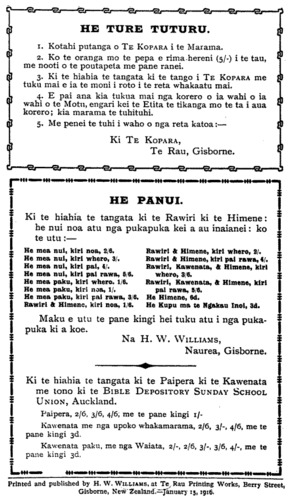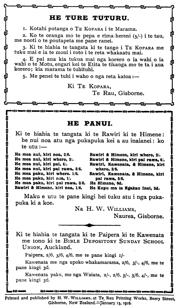 HE TURE TUTURU. 1. Kotahi putanga o TE KOPARA i te Marama. 2. Ko te oranga mo te pepa e rima hereni (5/-) i te tau, me nooti o te poutapeta me pane ranei. 3. Ki te hiahia te tangata ki te tango i TE KOPARA me tuku mai e ia te moni i roto i te reta whakaatu mai. 4. E pai ana kia tukua mai nga korero o ia wahi o ia wahi o te Motu, engari kei te Etita te tikanga mo te ta i aua korero; kia marama te tohituhi. 5. Me penei te tuhi i waho o nga reta katoa: - Ki TE KOPARA, Te Rau, Gisborne. HE PANUI. Ki te hiahia te tangata ki te Rawiri ki te Himene: he nui noa atu nga pukapuka kei a au inaianei: ko te utu: - He mea nui, kiri noa, 2/6. He mea nui, kiri whero, 3/. He mea nui, kiri pai, 4/. He mea nui, kiri pai rawa, 5/6. He mea paku, kiri whero. 1/6. He mea paku, kiri noa, 1/. He mea paku, kiri pai rawa, 3/6. Rawiri & Himene, kiri noa, 1/6. Rawiri & Himene, kiri whero, 2/. Rawiri & Himene, kiri pai rawa, 4/. Rawiri, Kawenata, & Himene, kiri whero, 3/6. Rawiri, Kawenata, & Himene, kiri pai rawa, 5/6. He Himene, 6d. He Kupu ma te Ngakau Inoi, 3d. Maku e utu te pane kingi hei tuku atu i nga pakapuka ki a koe. Na H. W. WILLIAMS, Naurea, Gisborne. Ki te hiahia te tangata ki te Paipera ki te Kawenata me tono ki te BIBLE DEPOSITORY SUNDAY SCHOOL UNION, Auckland. Paipera, 2/6, 3/6, 4/6, me te pane kingi 1/- Kawenata me nga upoko whakamarama, 2/6, 3/-, 4/6, me te pane kingi 3d. Kawenata paku, me nga Waiata, 2/-, 2/6, 3/-, 3/6, 4/-, me te pane kingi 3d. Printed and published by H. W. WILLIAMS, at Te Rau Printing Works, Berry Street Gisborne, New Zealand. - December 15, 1915.