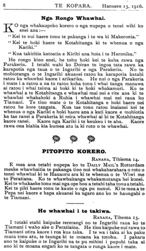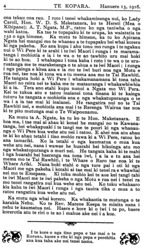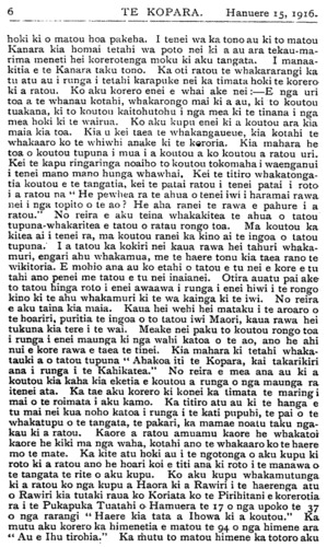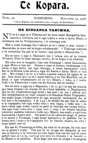 Te Kopara. NAMA 27. GISBORNE. HANUERE 15, 1916. "Iti te Kopera, kai takirikiri ana i runga i te Kahikatea." HE HINGANGA TANIWHA. NO te 9 o nga ra o Tihema nei ka moe tenei Rangatira kau matua e mihiotia nei e nga topito e wha o tatou Motu, o Aotearoa me te Waipounamu, i te moenga roa. Mai o tona maenga iho i takoto ai ia i tenei o ana marae i Manutuke (e mau nei te kupu whakatauki: "Toia nga waewae o to tamahine kia pai ai te haere i nga parae o Manutuke.") No te toru o nga o Hanuere nei i tukua atu ai te tinana Wiremu Pere ki tona kainga tuturu, ki te kopu o te whenua. He tino nui te tangata i tae mai kitetangi i tenei kaumatua. O nga Motu e rua nei. Kaore e taea te korero whakatepe o te ahua, o nga mahi, me nga tikanga, a tenei kaumatua; otira kei te mohiotia tona ahua e nga iwi katoa o tatou Motu e rua nei. Mo runga i te tu a o tatou tupuna matua ka ngaro ki te po; kua mutu atu i a ia i tenei takiwa o te Tai Rawhiti, me te ahua o ana whakahaere ki te iwi Maori, i roto, a i waho hoki o te Paremata i tona wa ko koutou kei te mohio. No te toru o nga ra o Hanuere, i te 11.30 i te ata ka mauria atu tana tinana i te marae, ki te whare karakia, e Ngatiporou (ko te iwi whakamutunga tenei i tae mai i te wa i nehua ai.) Ka whakahaerea te wahi tuatahi o te Karakia Nehu Tupapaku me etahi kupu whakamarie ki nga tamariki mokopuna me te iwi nui o te tupapaku. I te 2.45 i te ahiahi ka tae mai te waka o te tupapaku me nga waka mau i ona hapu, i neke atu i te toru retau nga waka, haere te paki te motoka me runga hoiho. Na nga hoia toko-ono i mau mai i roto i te whare karakia tokotoru pakeha tokotoru hoki nga Maori, me etahi o nga hoia kaumatua i haere tahi. Ka puta mai ki waho ka tangi te peene o te taone o Turanga, i nga tangi apakura a te pakeha me te haere ano i mua o te tupapaku mo te hawhe maero, ka riro i mua tatari mai ai. Ka tae ki Waerenga-a-hika, ka tata ki te urupa, ka riro ano na te peene i arahi. Tae atu ki te urupa ka rangona te reo me te haruru o te waewae ko ona hapu kua tae ke mai ki mua pohiri mai ai i a ia, maringi ana tera te roimata i te kanohi o te Maori o te pakeha. Kua kapi noa atu te urupa i te tangata