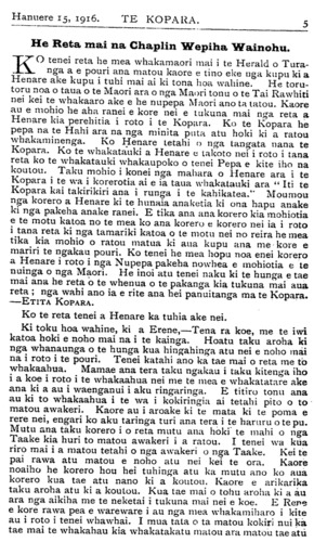 He Reta mai na Chaplin Wepiha Wainohu. KO tenei reta he mea whakamaori mai i te Herald o Turanga a e pouri ana matou kaore e tino eke nga kupu ki a Henare ake kupu i tuhi mai ai ki tona hoa wahine. He torutoru noa o taua o te Maori ara o nga Maori tonu o te Tai Rawhiti nei kei te whakaaro ake e he nupepa Maori ano ta tatou. Kaore au e mohio he aha ranei e kore nei e tukuna mai nga reta a Henare kia perehitia i roto i te Kopara. Ko te Kopara he pepa na te Hahi ara na nga minita puta atu hoki ki a ratou whakaminenga. Ko Henare tetahi o nga tangata nana te Kopara. Ko te whakatauki a Henare e takoto nei i roto i tana reta ko te whakatauki whakaupoko o tenei Pepa e kite iho na koutou. Taku mohio i konei nga mahara o Henare ara i te Kopara i te wa i korerotia ai e ia taua whakatauki ara "Iti te Kopara kai takirikiri ana i runga i te kahikatea." Moumou nga korero a Henare ki te hunaia anaketia ki ona hapu anake ki nga pakeha anake ranei. E tika ana ana korero kia mohiotia e te motu katoa no te mea ko ana korero e korero nei ia i roto i tana reta ki nga tamariki katoa o te motu nei no reira he mea tika kia mohio o ratou matua ki aua kupu ana me kore e mariri te ngakau pouri. Ko tenei he mea hopu noa enei korero a Henare i roto i nga Nupepa pakeha nowhea e mohiotia e te nuinga o nga Maori. He inoi atu tenei naku ki te hunga e tae mai ana he reta o te whenua o te pakanga kia tukuna mai aua reta; nga wahi ano ia e rite ana hei panuitanga ma te Kopara. - ETITA KOPARA. Ko te reta tenei a Henare ka tuhia ake nei. Ki toku hoa wahine, ki a Erene, - Tena ra koe, me te iwi katoa hoki e noho mai na i te kainga. Hoatu taku aroha ki nga whanaunga o te hunga kua hingahinga atu nei e noho mai na i roto i te pouri. Tenei katahi ano ka tae mai o reta me to whakaahua. Mamae ana tera taku ngakau i taku kitenga iho i a koe i roto i te whakaahua nei me te mea e whakatatare ake ana ki a au i waenganui i aku ringaringa. E titiro tonu ana au ki to whakaahua i te wa i kokiringia ai tetahi pito o to matou awakeri. Kaore au i aroake ki te mata ki te poma e rere nei, engari ko aku taringa turi ana tera i te haruru o te pu. Mutu ana taku korero i o reta mutu ana hoki te mahi o nga Taake kia huri to matou awakeri i a ratou. I tenei wa kua riro mai i a matou tetahi o nga awakeri o nga Taake. Kei te pai rawa atu matou e noho atu nei kei te ora. Kaore noaiho he korero hou hei tuhinga atu ka mutu ano ko aua korero kua tae atu nano ki a koutou. Kaore e arikarika taku aroha atu ki a koutou. Kua tae mai o tohu aroha ki a au ara nga aikiha me te neketai i tukuna mai nei e koe. E Rene e kore rawa pea e wareware i au nga mea whakamiharo i kite au i roto i tenei whawhai. I mua tata o ta matou kokiri nui ka tae mai te whakahau kia whakatakatu matou ara matou tae atu