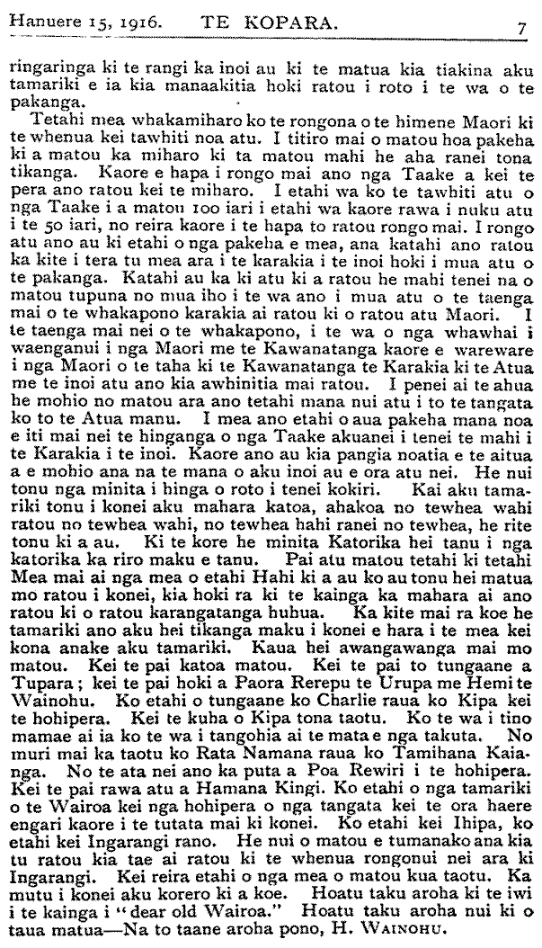 ringaringa ki te rangi ka inoi au ki te matua kia tiakina aku tamariki e ia kia manaakitia hoki ratou i roto i te wa o te pakanga. Tetahi mea whakamiharo ko te rongona o te himene Maori ki te whenua kei tawhiti noa atu. I titiro mai o matou hoa pakeha ki a matou ka miharo ki ta matou mahi he aha ranei tona tikanga. Kaore e hapa i rongo mai ano nga Taake a kei te pera ano ratou kei te miharo. I etahi wa ko te tawhiti atu o nga Taake i a matou 100 iari i etahi wa kaore rawa i nuku atu i te 50 iari, no reira kaore i te hapa to ratou rongo mai. I rongo atu ano au ki etahi o nga pakeha e mea, ana katahi ano ratou ka kite i tera tu mea ara i te karakia i te inoi hoki i mua atu o te pakanga. Katahi au ka ki atu ki a ratou he mahi tenei na o matou tupuna no mua iho i te wa ano i mua atu o te taenga mai o te whakapono karakia ai ratou ki o ratou atu Maori. I te taenga mai nei o te whakapono, i te wa o nga whawhai i waenganui i nga Maori me te Kawanatanga kaore e wareware i nga Maori o te taha ki te Kawanatanga te Karakia ki te Atua me te inoi atu ano kia awhinitia mai ratou. I penei ai te ahua he mohio no matou ara ano tetahi mana nui atu i to te tangata ko to te Atua manu. I mea ano etahi o aua pakeha mana noa e iti mai nei te hinganga o nga Taake akuanei i tenei te mahi i te Karakia i te inoi. Kaore ano au kia pangia noatia e te aitua a e mohio ana na te mana o aku inoi au e ora atu nei. He nui tonu nga minita i hinga o roto i tenei kokiri. Kai aku tamariki tonu i konei aku mahara katoa, ahakoa no tewhea wahi ratou no tewhea wahi, no tewhea hahi ranei no tewhea, he rite tonu ki a au. Ki te kore he minita Katorika hei tanu i nga katorika ka riro maku e tanu. Pai atu matou tetahi ki tetahi Mea mai ai nga mea o etahi Hahi ki a au ko au tonu hei matua mo ratou i konei, kia hoki ra ki te kainga ka mahara ai ano ratou ki o ratou karangatanga huhua. Ka kite mai ra koe he tamariki ano aku hei tikanga maku i konei e hara i te mea kei kona anake aku tamariki. Kaua hei awangawanga mai mo matou. Kei te pai katoa matou. Kei te pai to tungaane a Tupara; kei te pai hoki a Paora Rerepu te Urupa me Hemi te Wainohu. Ko etahi o tungaane ko Charlie raua ko Kipa kei te hohipera. Kei te kuha o Kipa tona taotu. Ko te wa i tino mamae ai ia ko te wa i tangohia ai te mata e nga takuta. No muri mai ka taotu ko Rata Namana raua ko Tamihana Kaianga. No te ata nei ano ka puta a Poa Rewiri i te hohipera. Kei te pai rawa atu a Hamana Kingi. Ko etahi o nga tamariki o te Wairoa kei nga hohipera o nga tangata kei te ora haere engari kaore i te tutata mai ki konei. Ko etahi kei Ihipa, ko etahi kei Ingarangi rano. He nui o matou e tumanako ana kia tu ratou kia tae ai ratou ki te whenua rongonui nei ara ki Ingarangi. Kei reira etahi o nga mea o matou kua taotu. Ka mutu i konei aku korero ki a koe. Hoatu taku aroha ki te iwi i te kainga i "dear old Wairoa." Hoatu taku aroha nui ki o taua matua - Na to taane aroha pono, H. WAINOHU.