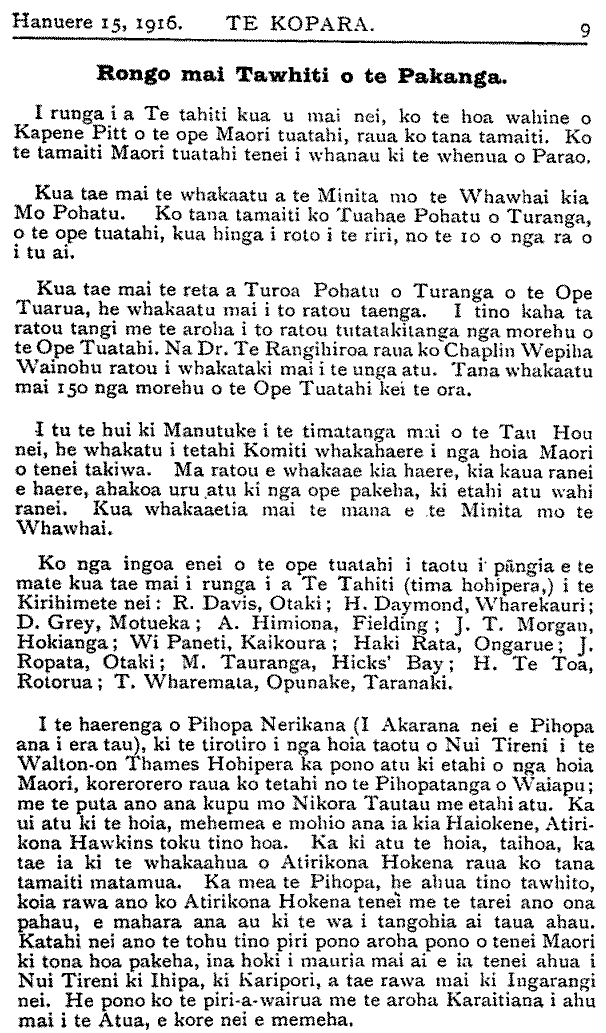 Rongo mai Tawhiti o te Pakanga. I runga i a Te tahiti kua u mai nei, ko te hoa wahine o Kapene Pitt o te ope Maori tuatahi, raua ko tana tamaiti. Ko te tamaiti Maori tuatahi tenei i whanau ki te whenua o Parao. Kua tae mai te whakaatu a te Minita mo te Whawhai kia Mo Pohatu. Ko tana tamaiti ko Tuahae Pohatu o Turanga, o te ope tuatahi, kua hinga i roto i te riri, no te ro o nga ra o i tu ai. Kua tae mai te reta a Turoa Pohatu o Turanga o te Ope Tuarua, he whakaatu mai i to ratou taenga. I tino kaha ta ratou tangi me te aroha i to ratou tutatakitanga nga morehu o te Ope Tuatahi. Na Dr. Te Rangihiroa raua ko Chaplin Wepiha Wainohu ratou i whakataki mai i te unga atu. Tana whakaatu mai 150 nga morehu o te Ope Tuatahi kei te ora. I tu te hui ki Manutuke i te timatanga mai o te Tau Hou nei, he whakatu i tetahi Komiti whakahaere i nga hoia Maori o tenei takiwa. Ma ratou e whakaae kia haere, kia kaua ranei e haere, ahakoa uru atu ki nga ope pakeha, ki etahi atu wahi ranei. Kua whakaaetia mai te mana e te Minita mo te Whawhai. Ko nga ingoa enei o te ope tuatahi i taotu i pangia e te mate kua tae mai i runga i a Te Tahiti (tima hohipera,) i te Kirihimete nei: R. Davis, Otaki; H. Daymond, Wharekauri; D. Grey, Motueka; A. Himiona, Fielding; J. T. Morgan Hokianga; Wi Paneti, Kaikoura; Haki Rata, Ongarue, J. Ropata, Otaki; M. Tauranga, Hicks' Bay, H. Te Toa, Rotorua; T. Wharemata, Opunake, Taranaki. I te haerenga o Pihopa Nerikana (I Akarana nei e Pihopa ana i era tau), ki te tirotiro i nga hoia taotu o Nui Tireni i te Walton on Thames Hohipera ka pono atu ki etahi o nga hoia Maori, korerorero raua ko tetahi no te Pihopatanga o Waiapu me te puta ano ana kupu mo Nikora Tautau me etahi atu. Ka ui atu ki te hoia, mehemea e mohio ana ia kia Haiokene, Atirikona Hawkins toku tino hoa. Ka ki atu te hoia, taihoa, ka tae ia ki te whakaahua o Atirikona Hokena raua ko tana tamaiti matamua. Ka mea te Pihopa, he ahua tino tawhito, koia rawa ano ko Atirikona Hokena tenei me te tarei ano ona pahau, e mahara ana au ki te wa i tangohia ai taua ahau. Katahi nei ano te tohu tino piri pono aroha pono o tenei Maori ki tona hoa pakeha, ina hoki i mauria mai ai e ia tenei ahua i Nui Tireni ki Ihipa, ki Karipori, a tae rawa mai ki Ingarangi nei. He pono ko te piri-a-wairua me te aroha Karaitiana i ahu mai i te Atua, e kore nei e memeha.