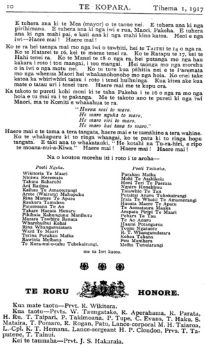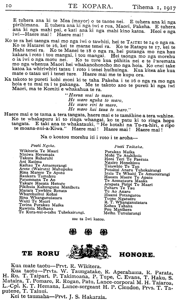 E tuhera ana ki te Mea (mayor) o te taone nei. E tuhera ana ki nga pirihimana. E tuhera ana ki nga iwi e rua Maori, Pakeha. E tuhera ana ki nga mahi pai e kati ana ki nga mahi kino katoa. Heoi e nga iwi - Haere mai ! Haere mai! Ko te ra hei taenga mai mo nga iwi o tawhiti hei te TAITEI te 14 o nga ra. Ko te Hatarei te 14, kei te marae tenei ra. Ko te Ratapu te 17, kei te Hahi tenei ra. Ko te Manei te 18 o nga ra, hei putanga mo nga hau kakara i roto i tou mangai i tou mangai. Hei taonga mo nga morehu o ia iwi o nga motu nei. Ko te ture kua pahitia nei e te Paremata mo nga whenua Maori hei whakanohonoho mo nga hoia. Ko enei take katoa ka whiriwhiri tatau i roto i tenei huihuinga. Kua kitea ake kua mate o tatau uri i tenei ture. Haere mai me te kupu ora. Ka takoto te pureti kohi moni ki te taha Pakeha i te 16 o nga ra mo nga hoia e tu mai ra i te pakanga. Me te takoto ano te pureti ki nga iwi Maori, ma te Komiti e whakahua te ra. "Hurua mai to maro. He maro nguha to maro, He maro riri to maro, He maro kai taua to maro." Haere mai e te tama a tera tangata, haere mai e te tamahine a tera wahine. Ko te whakapuru ki to ringa whangai ko te patu ki to ringa hopu tangata. E taki ana to whakatauki " He kotahi na Tu-ra-hiri, e ripo te moana-nui-a-Kiwa." Haere mai! Haere mai! Haere mai ! Na o koutou morehu iti i roto i te aroha - Pooti Ngehe. Wikitoria Te Maari Niniwa Heremaia Takuta Raharuhi Ani Ratima KaihauTe Amaoterangi Arete (Wairata) Mahupuku Rina Marere Te Apatu Raukura Tamahau Patumoana Te Ao Takare Haeata Henare Pikihuia Kahungunu Manihera Marara Tawhiro Renata Wharehuihui Kohai Rina Whanganuiatara Waiti Te Maari Terina Purakau Maika Rawinia Meihana Te Kura-nui-o-tahu Tuhekairangi. Pooti Taikaha. Purakau Maika Mohi Te Atahikoia Honi Teri Te Paerata Ngairo Honehimu Taiawhio Te Tau Putaitai Anaru Tuhokairangi Iraia Te Whaiti Te Amaoterangi Haeata Maere Te Apatu Te Aomataura Maaka Arapata Piripi Te Maari Puhara Te Tau Te Ao Anaru Haami Potangaroa Teone Ngatuere R. T. Whanganuiatara Kohea Tahana Pou Manihera Meiha Tunuiarangi me ta Iwi katoa. TE RORU HONORE. Kua mate taotu - Prvt. R. Wikitera. Kua taotu - Prvts . W. Taungatake, R. Aperahama, R. Parata, H. Ru, T. Taipari, P. Takimoana, P. Tupe, C. Evans, T. Haku, S Mataira, T. Pomare, R. Rogan, Patu, Lance-corporal M. H. Taiaroa L.-Cpl. K;. T. Hemana, Lance-sergeant H. P. Clendon, Prvs. T. Taputene, T. Tainui. Kei te taumaha - Prvt. J. S. Hakaraia.