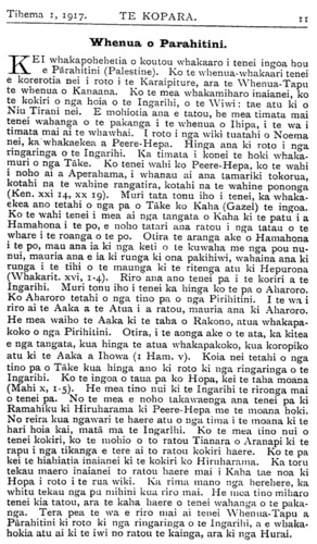 Whenua o Parahitini. KEI whahapohehetia o koutou whakaaro i tenei ingoa hou e Parahitini (Palestine). Ko te whenua-whakaari tenei e korerotia nei i roto i te Karaipiture, ara te Whenua-Tapu te whenua o Kanaana. Ko te mea whakamiharo inaianei, ko te kohiri o nga hoia o te Ingarihi, o te Wiwi: tae atu ki o Niu Tirani nei. E mohiotia ana e tatou, he mea timata mai tenei wahanga o te pakanga i te whenua o Ihipa, i te wa i timata mai ai te whawhai. I roto i nga wiki tuatahi o Noema nei, ka whakaekea a Peere-Hepa. Hinga ana ki roto i nga ringaringa o te Ingarihi. Ka timata i konei te hoki whakamuri o nga Take. Ko tenei wahi ko Peere-Hepa, ko te wahi i noho ai a Aperahama, i whanau ai ana tamariki tokorua, kotahi na te wahine rangatira, kotahi na te wahine pononga (Ken. xxi 14 xx 19). Muri tata tonu iho i tenei ka whakaekea ano tetahi o nga pa o Take ko Kaha (Gazel) te ingoa. Ko te wahi tenei i mea ai nga tangata o kaha ki te patu i a Hamahona i te po, e noho tatari ana ratou i nga tatau o te whare i te roanga o te po. Otira te aranga ake o Hamahona i te po, mau ana ia ki nga keti o te kuwaha me nga pou nunui, mauria ana e ia ki runga ki ona pakihiwi, wahaina ana ki runga i te tihi o te maunga ki te ritenga atu ki Hepurona (Whakarit. xvi, 1-4). Riro ana ano tenei pa i te koriri a te Ingarihi. Muri tonu iho i tenei ka hinga ko te pa o Aharoro. Ko Aharoro tetahi o nga tino pa o nga Pirihitini. I te wa i riro ai te Aaka a te Atua i a ratou, mauria ana ki Aharoro. He mea waiho te Aaka ki te taha o Rakono, atua whakapakoko o nga Pirihitini. Otira, i te aonga ake o te ata, ka kitea e nga tangata, kua hingra te atua whakapakoko, kua koropiko atu ki te Aaka a Ihowa (I Ham. v). Koia nei tetahi o nga tino pa o Take kua hinga ano ki roto ki nga ringaringa o te Ingarihi. Ko te ingoa o taua pa ko Hopa, kei te taha moana (Mahi x, 1-5). He mea tino nui ki te Ingarihi te rironga mai o tenei pa. No te mea e noho takawaenga ana tenei pa ki Ramahiku ki Hiruharama ki Peere-Hepa me te moana hoki. No reira kua ngawari te haere atu o nga tima i te moana ki te hari hoia kai, mata ma te Ingarlhi. Ko te mea tino nui o tenei kokiri, ko te mohio o to ratou Tianara o Aranapi ki te rapu i nga tikanga e tere ai to ratou kokiri haere. Ko te pa kei te hiahiatia inaianei ki te kokiri ko Hiruharama. Ka toru tekau maero inaianei to ratou haere mai i Kaha tae noa ki Hopa i roto i te rua wiki. ka rima mano nga herehere, ka whitu tekau nga pu mihini kua riro mai. He mea tino miharo tenei kia tatou, ara te kaha haere o tenei wahanga o te pakanga. Tera pea te wa e riro mai ai tenei Whenua-Tapu a Parahitini ki roto ki nga ringaringa o te Ingarihi, a e whakahokia atu ai ki te iwi no ratou te kainga, ara ki nga Hurai.