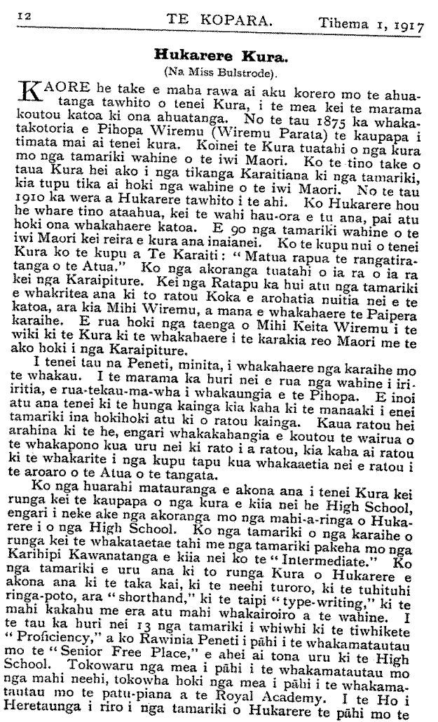 Hukarere Kura. (Na Miss Bulstrode). KAORE he take e maha rawa ai aku korero mo te ahuatanga tawhito o tenei Kura, i te mea kei te marama koutou katoa ki ona ahuatanga. No te tau 1875 ka whakatakotoria e Pihopa Wiremu (Wiremu Parata) te kaupapa i timata mai ai tenei kura. Koinei te Kura tuatahi o nga kura mo nga tamariki wahine o te iwi Maori. Ko te tino take o taua Kura hei ako i nga tikanga Karaitiana ki nga tamariki, kia tupu tika ai hoki nga wahine o te iwi Maori. No te tau 1910 ka wera a Hukarere tawhito i te ahi. Ko Hukarere hou he whare tino ataahua, kei te wahi hau-ora e tu ana, pai atu hoki ona whakahaere katoa. E go nga tamariki wahine o te iwi Maori kei reira e kura ana inaianei. Ko te kupu nui o tenei Kura ko te kupu a Te Karaiti: " Matua rapua te rangatiratanga o te Atua." Ko nga akoranga tuatahi o ia ra o ia ra kei nga Karaipiture. Kei nga Ratapu ka hui atu nga tamariki e whakritea ana ki to ratou Koka e arohatia nuitia nei e te katoa, ara kia Mihi Wiremu, a mana e whakahaere te Paipera karaihe E rua hoki nga taenga o Mihi Keita Wiremu i te wiki ki te Kura ki te whakahaere i te karakia reo Maori me te ako hoki i nga Karaipiture. I tenei tau na Peneti, minita, i whakahaere nga karaihe mo te whakau. I te marama ka huri nei e rua nga wahine i iriiritia, e rua-tekauma-wha i whakaungia e te Pihopa. E inoi atu ana tenei ki te hunga kainga kia kaha ki te manaaki i enei tamariki ina hokihoki atu ki o ratou kainga. Kaua ratou hei arahina ki te he, engari whakakahangia e koutou te wairua o te whakapono kua uru nei ki rato i a ratou, kia kaha ai ratou ki te whakarite i nga kupu tapu kua whakaaetia nei e ratou i te aroaro o te Atua o te tangata. Ko nga huarahi matauranga e akona ana i tenei Kura kei runga kei te kaupapa o nga kura e kiia nei he High School, engari i neke ake nga akoranga mo nga mahi-a-ringa o Hukarere i o nga High School. Ko nga tamariki o nga karaihe o runga kei te whakataetae tahi me nga tamariki pakeha mo nga Karihipi Kawanatanga e kiia nei ko te " Intermediate." Ko nga tamariki e uru ana ki to runga Kura o Hukarere e akona ana ki te taka kai, ki te neehi turoro, ki te tuhituhi ringa-poto, ara " shorthand," ki te taipi " type-writing," ki te mahi kakahu me era atu mahi whakairoiro a te wahine. I te tau ka huri nei 13 nga tamariki i whiwhi ki te tiwhikete " Proficiency," a ko Rawinia Peneti i pahi i te whakamatautau mo te " Senior Free Place," e ahei ai tona uru ki te High School. Tokowaru nga mea i pahi i te whakamatautau mo nga mahi neehi, tokowha hoki nga mea i pahi i te whakamatautau mo te patu-piana a te Royal Academy. I te Ho i Heretaunga i riro i nga tamariki o Hukarere te pahi mo te