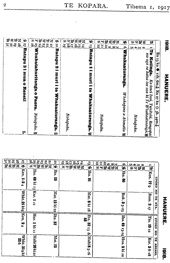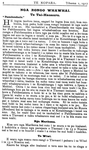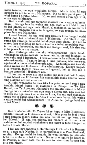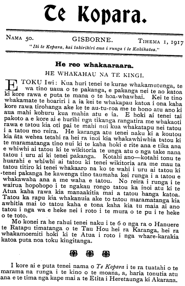 Te Kopara. NAMA 50. GISBORNE. TIHEMA 1, 1917 "Iti te Kopara hai takirikiri ana i runga i te Kahikatea." He reo whakaaraara. HE WHAKAHAU NA TE KINGI. E TOKU Iwi: Kua huri tenei te kurae whakamutunga, te wa tino uaua o te pakanga, e pakanga nei te ao katoa ki kore rawa e puta te mana o te hoa-whawhai. Kei te tino whakamate te hoariri i a ia kei te whakapau katoa i ona kaha kore rawa tirohanga ake ke te au-tu-roa me te hono atu ano ki aua mahi kohuru koa mahia atu e ia. E hoki ai tenei tai pakoto a e kore ai e hurihi nga tikanga rangatira me whakaoti rawa e tatou kia oti pai te mahi nui kua whakatapu nei tatou i a tatou mo reira. He karanga atu tenei naku ki a koutou kia ata wehea tetahi ra hei ra inoi kia whakawhiwhia tatou ki te maramatanga tino nui ki te kaha hoki e rite ana e tika ana e whiwhi ai tatou ki te wikitoria te unga atu o nga take nana tatou i uru ai ki tenei pakanga. Kotahi ano - kotahi tonu te huarahi e whiwhi ai tatou ki tenei wikitoria ara me mau ta tatou titiro ki tenei whakaaro na ko te wahi i uru ai tatou ki tenei pakanga he kawenga tino taumaha kei runga i a tatou e whakawakia ana a me waha e tatou. No reira i runga i te wairua hopohopo i te ngakau rongo tatou ka inoi atu ki te Atua kaha rawa kia manaakitia mai a tatou hanga katoa. Tatou ka rapu kia whakanuia ake to tatou maramatanga kia awhitia mai to tatou kaha e tona kaha kia tu maia ai ano tatou i nga wa e heke nei i roto i te mura o te pu i te heke o te toto. Mo konei ra he rahui tenei naku i te 6 o nga ra o Hanuere te Ratapu timatanga o te Tau Hou hei ra Karanga, hei ra whakamaemiti hoki ki te Atua i roto i nga whare-karakia katoa puta noa toku kingitanga. I kore ai e puta tenei nama o Te Kopara i te ra tuatahi o te marama na runga i te kino o te moana, a, haria tonutia atu ana e te tima nga kape mai a te Etita i Heretaunga ki Akarana.