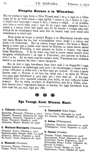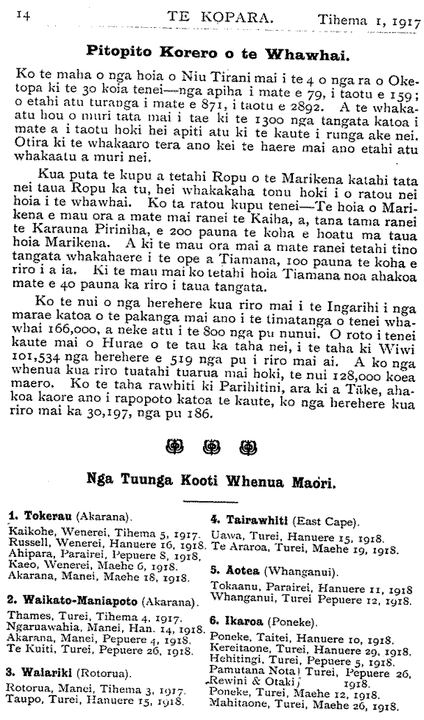 Pitopito Korero o te Whawhai. Ko te maha o nga hoia o Niu Tirani mai i te 4 o nga ra o Oketopa ki te 30 koia tenei, nga apiha i mate e 79, i taotu e 159; etahi atu turanga i mate e 871, i taotu e 2892. A te whakaatu hou o muri tata mai i tae ki te 1300 nga tangata katoa i mate a i taotu hoki hei apiti atu ki te kaute i runga ake nei Otira ki te whakaaro tera ano kei te haere mai aro etahi atu whakaatu a muri nei. Kua puta te kupu a tetahi Ropu o te Marikena katahi tata nei taua Ropu ka tu, hei whakakaha tonu hoki i o ratou nei hoia i te whawhai. Ko ta ratou kupu tenei, Te hoia o Marikena e mau ora a mate mai ranei te Kaiha, a, tana tama ranei te Karauna Piriniha, e 200 pauna te koha e hoatu ma tana hoia Marikena. A ki te mau ora mai a mate ranei tetahi tino tangata whakahaere i te ope a Tiamana, 100 pauna te koha e riro i a ia. Ki te mau mai ko tetahi hoia Tiamana noa ahakoa mate e 40 pauna ka riro i tana tangata. Ko te nui o nga herehere kua riro mai i te Ingarihi i nga marae katoa o te pakanga mai ano i te timatanga o tenei whawhai 166,000, a neke atu i te 800 nga pu nunui. O roto i tenei kaute mai o Hurae o te tau ka taha nei, i te taha ki Wiwi 101,534 nga herehere e 519 nga pu i riro mai ai. A ko nga whenua kua riro tuatahi tuarua mai hoki, te nui 123,000 koea maero. Ko te taha rawhiti ki Parihitini, ara ki a Take, ahakoa kaore ano i rapopoto katoa te kaute, ko nga herehere kua riro mai ka 30,I97, nga pu 186. Nga Tuunga Kooti Whenua Maori. 1. Tokerau (Akarana). Kaikohe, Wenerei, Tihema 5, 1917. Russell, Wenerei, Hanuere 16, 1918. Ahipara, Parairei, Pepuere 8, 1918, Kaeo, Wenerei, Maehe 6, 1918. Akarana, Manei, Maehe 18, 1918. 2. Waikato-Maniapoto(Akarana). Thames, Turei, Tihema 4, 1917. Ngaruawahia, Manei, Han. 14, 1918. Akarana, Manei, Pepuere 4, 1918. Te Kuiti, Turei, Pepuere 26, 1918. 3. Waiariki (Rotorua). Rotorua, Manei, Tihema 3, 1917. Taupo, Turei, Hanuere 15, 1918. 4. Tairawhiti (East Cape). Uawa, Turei, Hanuere 15, 1918. Te Araroa, Turei, Maehe 19, 1918. 5. Aotea (Whanganui). Tokaanu, Parairei, Hanuere 11, 1918 Whanganui, Turei Pepuere 12, 1918. 6. lkaroa (Poneke). Poneke, Taitei, Hanuere 10, 1918. Kereitaone, Turei, Hanuere 29, 1918. Hehitingi, Turei, Pepuere 5, 1918. Pamutana Nota Turei, Pepuere 26 Rewini & Otaki 1918. Poneke, Turei, Maehe 12, 1918. Mahitaone, Turei, Maehe 26, 1918.
