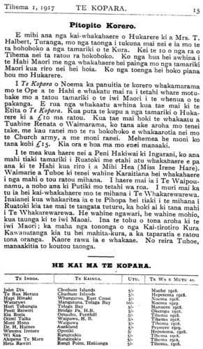 Pitopito Korero. E mihi ana nga kai-whakahaere o Hukarere ki a Mrs. T. Halbert, Turanga, mo nga taonga i tukuna mai nei e ia mo te ra hohohoko a nga tamariki o te Kura. kei te 10 o nga ra o Tihema nei ta ratou ra hokohoko. Ko nga hua hei awhina i te Hahi Maori me nga whakahaere hei painga mo nga tamariki Maori kua riro nei hei hoia. Ko nga toenga hei hoko piana hou mo Hukarere. I Te Kopara o Noema ka panuitia te korero whakamarama mo te Ope a te Hahi e whakatu mai ra i tetahi whare motuhake mo a tatou tamariki o te iwi Maori i te whenua o te pakanga. E rua nga whakaatu awhina kua tae mai ki te Etita o Te Kopara. Kua puta te kupu a nga tamarilti o Hukarere ki a £10 ma ratou. kua tae mai hoki te whakaatu a Tuahine Renata o Waimarama, ko tana ake aroha mo tenei take, me kau ranei mo te ra hokohoko e whakaarotia nei mo te Church army, a me moni ranei. Mehemea he moni ko tana kohi £15. Kia ora e hoa ma mo enei manaaki. I te mea kua haere nei a Peni Hakiwai ki Ingarani, ko ana mahi tiaki tamariki i Ruatoki me etahi atu whakahaere e pa ana ki te Hahi kua riro i a Mihi Hea (Miss Irene Hare). Waimarie a Tuhoe ki tenei wahine Karaitiana hei whakahaere i nga mahi o tou ratou mihana. I haere mai ia i Te Waipounamu, a noho ana ki Putiki mo tetahi wa roa. I muri mai ka tu ia hei kai-whakahaere mo te mihana i Te Whakarewarewa. Inaianei kua whakaritea ia e te Pihopa hei tiaki i te mihana i Ruatoki kia tae mai te tangata tuturu, ka hoki ai ki tana mahi i Te Whakarewarewa. He wahine ngawari, he wahine mohio kua taunga ki te iwi Maoai. Ina te tohu o tona aroha ki te iwi Maori; ka maha nga tononga o nga Kai-tirotiro Kura Kawanatanga kia tu hei mahita-kura, a ka taparatia e ratou tona oranga. Kaore rawa ia e whakaae. No reira Tuhoe manaakitia to koutou taonga. HE KAI MA TE KOPARA. TE INGOA TE: KAINGA. UTU. TE WA E MUTU AI. John Dix Chatham Islands 5/- Maehe 1918. Te Rua Herata Chatham Islands 5/- Hepetema 1918. Hapi Hinaki Whangaroa, East Coast 5/- Noema 1918. Watarawi Mangatuna, Tolaga Bay 10/- Noema 19I9. Hori Tohungia Tolaga Bay 5/- Hanuere 1918. Peeti Reiwiri Bridge Pa, H.B. 5/ Oketopa 1918. Kia Rotia Omaahu, Ferrihill 5/- Tihema 1918. Otimi Taika Waipawa, H. B. 5/- Tihema 1918. Moni Hona Waipawa 5/- Tihema 1918. Dr. H. Haines Auckland 5/- Pepuere 1919. Wiremu Iretoro Opotiki 5/ Hepetema, 1918. Wi Kaa Rangitukia 5/- Tihema 1918. Ahipene Te Maro Rangitukia 5/- Tihema 1918. Heta Rawiri Rangi Point, Hokianga 5/- Tihema, 1918.