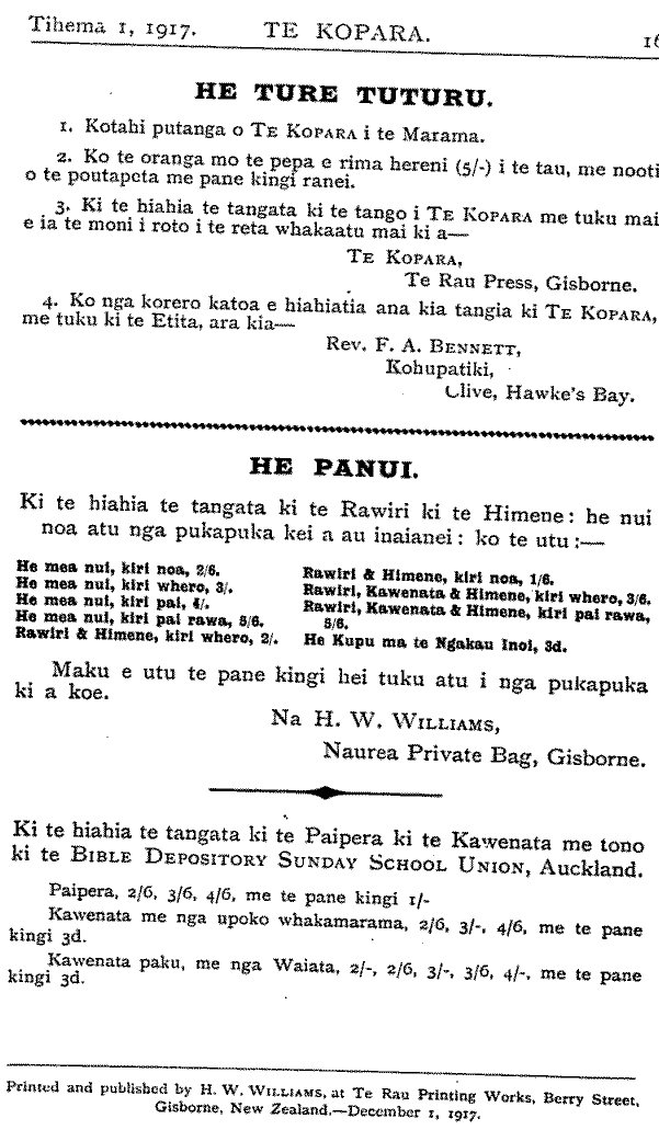 HE TURE TUTURU. 1. Kotahi putanga o TE KOPARA i te Marama. 2. Ko te oranga mo te pepa e rima hereni (5/-) i te tau, me nooti o te poutapeta me pane kingi ranei. 3. Ki te hiahia te tangata ki te tango i TE KOPARA me tuku mai e ia te moni i roto i te reta whakaatu mai ki a - TE KOPARA, Te Rau Press, Gisborne. 4. Ko nga korero katoa e hiahiatia ana kia tangia ki TE KOPARA, me tuku ki te Etita, ara kia - Rev. F. A. BENNETT, Kohupatiki, Clive, Hawke's Bay. HE PANUI. Ki te hiahia te tangata ki te Rawiri ki te Himene: he nui noa atu nga pukapuka kei a au inaianei: ko te utu: - Ha mea nui, kiri noa, 2/6. Rawiri & Himene, kiri noa, 1/6. He mea nui, kiri whero, 3/. Rawiri, Kawenata & Himene, kiri whero, 3/6. He mea nui, kiri pai, 4/. Rawiri, Kawenata & Himene, kiri pai rawa, 5/6. He mea nui, kiri pai rawa, 5/6. Rawiri & Himene, kiri whero, 2/. He Kupu ma te Ngakau Inoi, 3d. Maku e utu te pane kingi hei toku atu i nga pukapuka ki a koe. Na H. W. WILLIAMS, Naurea Private Bag, Gisborne. Ki te hiahia te tangata ki te Paipera ki te Kawenata me tono ki te BIBLE DEPOSITORY SUNDAY SCHOOL UNION, Auckland. Paipera, 2/6, 3/6, 4/6, me te pane kingi 1/- Kawenata me nga upoko whakamarama, 2/6, 3/-, 4/6, me te pane kingi 3d. Kawenata paku, me nga Waiata, 2/-, 2/6, 3/-, 3/6, 4/-, me te pane kingi 3d. Printed and published by H. W. WILLIAMS, at Te Rau Printing Works, Berry Street, Gisborne, New Zealand. - December 1, 1917.