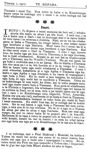 Tiamani i tenei Tai. Kua maro te kaha o te Kotahitanga kaore rawa he wehinga atu o tenei i te noho kainga nei kei hoki whakamuri ano. Itari. I ROTO i Te Kopara o tenei marama ka hori nei, i whaka aturia kia tatou te ahua i pa kia Itari. I tera tau, i te wa e kaha ana a Itari, i tae te mutunga mai o ta ratou kokiri ki roto rawa i te whenua o Ahitiria. Kati, no te wa ka whakapaua te kaha o Tiamana, ka rongo tatou, e ono tekau mano nga herehere o nga Itariana. Muri tonu iho i tenei, ka ki a Tiamana kotahi rau mano nga herehere o nga Itariana. Kai te tika tenei mate o Itari ia Tiamana. I roto i nga korero hou, he maha nga pa kua riro ia Tiamana, a ko nga Itariana kei te hoki whakamuri. Kotahi te pa nui kei te whakamatea atu e Tiamana, ara ko Wenihi (Venice). He pa nui tenei, he pa hoki e mohiotia ana e te ao katoa. Ko te hiahia o Tiamana kia riro tana pa i a ia, kia houhia ai e ia te rongo ki a Itari. Kei te haere tonu nga mahi whakawai a Tiamana. I roto i enei whawhai, kakahuria ai e nga Apiha o Tiamana nga kakahu o nga Apiha o nga Itariana, a ka haere ki waenganui i nga hoia o Itari. Ko te mahi a ana tangata, he tohutohu i nga hoia, ki nga wahi kei te ngoikore a Tiamana. Otira no te kokiritanga ki aua wahi, ka kitea, kei te noho paepae tonu mai nga mano mano hoia a Tiamana. Kua puta te whaikorero a te Pirimia o Ingarani, kia whakaaro-kotahi nga iwi katoa ki te awhina ia Itari, no te mea, tera e pa tetahi nawe nui ki nga iwi i raro i te Kotahitanga (ara Ingarihi, Wiwi, Amerika Ruhia me era atu iwi), mehemea ki te mate a Itari ia Tiamana. Kei te whakakaikatia inaianei te tuku hoia, pu, mata ki Itari i tenei marama. Ko etahi kua tae, ko te nuinga kei te kokiri tonu. Ko te nui katoa o nga hoia o Tiamana kei tera wahanga, e tata ana ki te rua miriona. No te 21 o nga ra o Noema ka ahua pai ake te ahua o nga Itariana. Kua tae mai nga rongo, ka nui to ratou kaha ki te pupuri atu i te hoa-riri. Mehemea ki te taea e ratou te pupuri atu te hoa-riri i roto i te wiki kotahi, katahi ka tau te mauri, i te mea ka whai taima mo nga hoia me nga pu a te Kotahitatanga ki te tae atu ki Itari. I te wehenga mai o Peni Hakiwai i Ruatoki, ka kohia e Tuhoe he moni hei aroha ma ratou ki to ratou matua kua maha nei nga tau e mahi ana i waenganui i a ratou. Ko ta ratou moni ma Peni me nga tamariki o Tuhoe ake, i Ingarani; me te £40 mo nga hoia Maori ahakoa he aha te hapu.