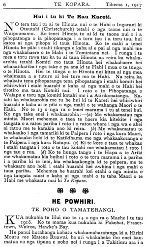 Hui i tu ki Te Rau Kareti. No tera tau i tu ai te Hinota nui o te Hahi o Ingarani ki Otautahi (Christchurch) tetahi o nga taone nui o te Waipounamu. Ko tenei Hinota tu ai ki te taone nui o i a pihopatanga o ia pihopatanga i a toru tau i a toru tau, hui katoa ai nga pihopa ki taua Hinota. Ko te mahi a tenei Hinota he pahi i etahi tikanga e kaha ai e pai ai nga mahi me nga whakahaere o te Hahi i te Tominiana nei. I runga i te mea e toru rawa tau ka tu ai taua Hinota na reira ka whakaarohia tetahi Komiti mo taua Hinota hei whakahaere hei whakatikatika i nga take e pa ana ki te Hahi i mua o te tunga o te Hinota. Hei te tunga o te Hinota nui kitea ai nga mea whaimana a e tuturu ai hei ture mo te Hahi. Na reira ka whakatu tena pihopatanga tena pihopatanga i etahi komiti hei whiriwhiri i etahi huarahi e kaha ai nga mahi o te Hahi hei tirotiro ma taua Komiti nui. I roto o te Pihopatanga o Waiapu e toru nga komiti kotahi mo i a Atirikonatanga. Katahi ka whakaarohia me tu he hui ki te Kareti hei whiriwhiri huarahi e kaha ai te piki o nga mahi o te wahanga Maori o te Hahi. No te 13 o nga ra o tenei marama i tu ai tenei hui. Ko nga take enei i whakaarohia: (a) Me whakamatau nga minita Maori mehemea e taea te haere kia kitekite i nga tangata o a ratou pariha i roto i o ratou whare i nga wa e ahei ai ratou me te karakia ano ki reira. (b) Me whakamatau te whakaako i nga tamariki ki te Paipera i roto i nga kura Maori, [e whakaako hoki ki te Katikihama me nga whakaakoranga o te Paipera i nga kura Ratapu. (c) Ki te kore e taea te whakau i etahi tangata i roto o te tau kotahi me whakamatau i roto i nga tau e rua. (d) Ko te hunga tango i te Hapa a te Ariki me whakamatau kia huihui i roto o te toru marama i a pariha i a pariha ki te inoi, kia whakaakongia ki te paipera, me te whakaaro ano hoki i etahi huarahi hei awhina i nga mahi o taua pariha. Mehemea he huarahi kei etahi o nga minita o nga tangata ranei e kaha ai nga mahi o te taha Maori o te Hahi me whakaatu mai ki Te Kopara. HE POWHIRI. TE POHO O TAMATERANGI. KUA nukuhia te Hui mo te 14 o nga ra o Maehe i te tau 1918. Ko te marae kua nukuhia ki Pakohai, Frasertown, Wairoa, Hawke's Bay. He panui hurahanga kohatu whakamaharatanga ki a Hirini Mouru me Matene Ruawai, he uri whakaheke iho enei kaumatua no nga tipuna e noho nei i runga i a Takitimu ara i a.