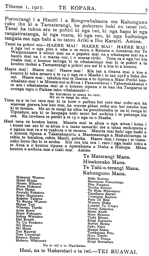 Porourangi i a Hauiti i a Rongowhakaata me Kahungunu tuku iho ki a Tamaterangi, he pukorero hoki no tenei iwi. Tenei ka tukua atu te pohiri ki nga iwi, ki nga hapu ki nga rangatiratanga, ki nga mana, ki nga reo, ki nga huihuinga tangata me nga hahi a to tatou Ariki a Ihu Karaiti. Amine. Tenei ka pohiri atu: - HAERE MAI ! HAERE MAI ! HAERE MAI ! e nga iwi o nga pito e wha o te motu o Kenana o Aotearoa mo Te Waipounamu e tuturi mai na e pepeke mai na e whakapae mai na e hautu mai na i o marae nui, i o marae ririki. Tena ra e nga iwi kia titaha mai o koutou taringa ki te whakarongo mai ki te pohiri a ta koutou mokai a Tamaterangi e pohiri atu nei ki a koe ki a koutou. Haere mai! Haere mai! Haere mai! Kia tae a tinana mai a koe a koutou ki toku aroaro a te 14 o nga ra o Maehe i te tau 1918 e heke iho nei. Haere mai; takahia mai te Ikaroa a to tipuna a Maui Potiki kau-whakatu-mai i te Moana-nui-a-Kiwa i Paraweranui i Tahumakakanui i te ara i whakaterea mai ai o koutou tipuna e te kau ika Tangaroa te urunga tapu o Paikea taku whakatauki: - He huruhuru te manu ka rere, He ao te rangi ka uhia. Tena ra e te iwi rere mai ki te kore o paihau hei rere mai noho atu ka waewae parera koe kau mai, ka wawae pikao noho atu kei totohu koe ki te moana. He ao te rangi ka uhia ka punahunahu te ua ki runga ki Tipuahou, ara ki te kaupapa kohi moni hei awhina i te pakanga kia ora. Ka tuwhera te pereti a te 15 o nga ra o Maehe. Heoi tena ra koutou katoa. Mauria mai te ahua o nga aitua i kona i i konei tae atu ki te aitua o a tatau tamariki me a tatau mokopuna e e ngaua mai ra e te tuakura o te moana. Mauria mai hoki nga mahi a o koutou tipuna a Takatakaputia a Marereatonga a Mahukitainga te rehia te harakoa, rehia Maori, pakeha. Haere mai i runga i te tumanako hono iho ki te aroha. Kia ora kia ora i raro i nga mahi tohu a te Atua a o koutou tipuna a Aperahama a Ihaka a Hakopa. Mana koutou e awhina mai e tiaki mai. Amine. Te Materangi Mana. Hinekorako Mana. Te Tahi-o-terangi Mana. Kahungunu Mana. Hukanui Watene Mohi Karena Hemi Huata Heremaia Pumaranga Hauea Mikaera Pire Paraone Hune Hukanui Tewha Kiripai Peta Hema Te Huia Hamutana Poutahi Pukeiotu Tamihana Karari Kopu Hamutana Urumingi Kapene Kapene Taiaroa Patu Te Rito Te Rauna Watene Watene Huka Hurae Toti Lemuel Te Urupu \\Whenua Tipoki Paetai Kaimona Arita Kerei Hemi Keefe Huae Puketapu Hare Kemara Kehua Winitana Tiaki Mitara Hei Erueti Kingi Karauria Te Ua Pouhenu Rawiri Hema Wi Hoeta Paku Nera Wi Hone Haami Kaata Teo Ruawai Tawhanata Peta Tete Urumingi Hata Tipoki Kiremu Rongo Hekera Ponga Mokena Whatuura Kingi Rotoatara Na te uri o te Hau-katoa. Heoi na te Hekeretari o te iwi: - TEI RUAWAI.