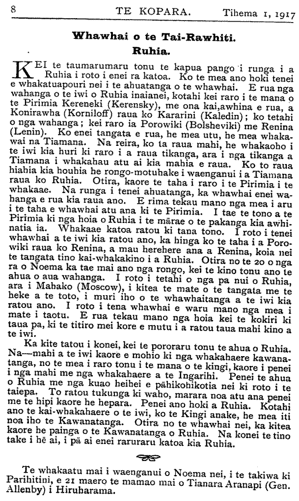 Whawhai o te Tai-Rawhiti. Ruhia. KEI te taumarumaru tonu te kapua pango i runga i a Ruhia i roto i enei ra katoa. Ko te mea ano hoki tenei e whakatuapouri nei i te ahuatanga o te whawhai. E rua nga wahanga o te iwi o Ruhia inaianei, kotahi kei raro i te mana o te Pirimia Kereneki (Kerensky), me ona kai,awhina e rua, a Konirawha (Korniloff) raua ko Kararini (Kaledin); ko tetahi o nga wahanga; kei raro ia Porowiki (Bolsheviki) me Renina (Lenin). Ko enei tangata e rua, he mea utu, he mea whakawai na Tiamana. Na reira, ko ta raua mahi, he whakaoho i te iwi kia huri ki raro i a rana tikanga, ara i nga tikanga a Tiamana i whakahau atu ai kia mahia e rana. Ko to raua hiahia kia houhia he rongo-motuhake i waenganui i a Tiamana rana ko Ruhia. Otira, kaore te taha i raro i te Pirimia i te whakaae. Na runga i tenei ahuatanga, ka whawhai enei wahanga e rua kia raua ano. E rima tekau mano nga mea i aru i te taha e whawhai atu ana ki te Pirimia. I tae te tono a te Pirimia ki nga hoia o Ruhia i te marae o te pakanga kia awhinatia ia. Whakaae katoa ratou ki tana tono. I roto i tenei whawhai a te iwi kia ratou ano, ka hinga ko te taha i a Porowiki raua ko Renina, a mau herehere ana a Renina, koia nei te tangata tino kai-whakakino i a Ruhia. Otira no te 20 o nga ra o Noema ka tae mai ano nga rongo, kei te kino tonu ano te ahua o aua wahanga. I roto i tetahi o nga pa nui o Ruhia, ara i Mahako (Moscow), i kitea te mate o te tangata me te heke a te toto, i muri iho o te whawhaitanga a te iwi kia ratou ano. I roto i tena whawhai e waru mano nga mea i mate i taotu. E rua tekau mano nga hoia kei te kokiri ki tana pa, ki te titiro mei kore e mutu i a ratou taua mahi kino a te iwi. Ka kite tatou i konei, kei te pororaru tonu te ahua o Ruhia Na - mahi a te iwi kaore e mohio ki nga whakahaere kawanatanga, no te mea i raro tonu i te mana o te kingi, kaore i penei i nga mahi me nga whakahaere a te Ingarihi. Penei te ahua o Ruhia me nga kuao heihei e pahikohikotia nei ki roto i te taiepa. To ratou tukunga ki waho, marara noa atu ana penei me te hipi kaore he hepara. Penei ano hoki a Ruhia. Kotahi ano te kaiwhakahaere o te iwi, ko te Kingi anake, he mea iti noa iho te Kawanatanga. Otira no te whawhai nei, ka kitea kaore he painga o te Kawanatanga o Ruhia. Na konei te tino take i he ai, i pa ai enei raruraru katoa kia Ruhia. Te whakaatu mai i waenganui o Noema nei, i te takiwa ki Parihitini, e 21 maero te mamao mai o Tianara Aranapi (Gen. Allenby) i Hiruharama.