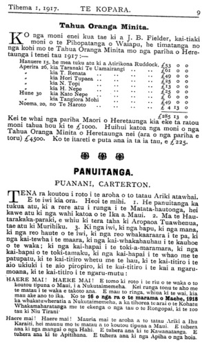 Tahua Oranga Minita. Ko nga moni enei kua tae ki a J. B. Fielder, kai-tiaki moni o te Pihopatanga o Waiapu, he timatanga no nga kohi mo te Tahua Oranga Minita mo nga pariha o Heretaunga i tenei tau 1917: - Hanuere 15, he mea tuku atu ki a Atirikona Ruddock, £53 0 0 Aperira 26, kia Taranaki Te Uamairangi £61 0 0 ,, kia T. Renata £49 0 0 ,, kia Hori Tupaea £25 0 0 ,, kia N. Topi £13 0 0 ,, kia H. Nepe £25 0 0 Hune 30 kia Kato Nepe £ 6 0 0 ,, kia Tangiora Mohi £49 0 0 Noema. 20, no Te Haroto £4 13 0 £285 13 0 Kei te whai nga pariha Maori o Heretaunga kia eke ta ratou moni tahua hou ki te £1000. Huihui katoa nga moni o nga Tahua Oranga Minita o Heretaunga nei (ara o nga pariha e toru) £4500. Ko te itareti e puta ana ia ta ia tau e £225. PANUITANGA. PUANANI, CARTERTON. TENA ra koutou i roto i te aroha o to tatau Ariki atawhai. E te iwi kia ora. Heoi te mihi. 1. He panuitanga ka tukua atu, ki a rere atu i runga i te Matata-hautonga, hei kawe atu ki nga wahi katoa o te Ika a Maui. 2. Ma te Hau-tarakaka-paraki, e whiu ki tera taha ki Aropaoa Tuawhenua, tae atu ki Murihiku. 3. Ki nga iwi, ki nga hapu, ki nga mana, ki nga reo haute o te iwi, ki nga reo whakaaraara i te pa, ki nga kaitewha i te maara, ki nga kai-whakahanhau i te kauhoe o te waka, ki nga kai-hapai i te toki-a-maramara, ki nga kai-hapai o te toki-tamaku, ki nga kai-hapai i te whao me te patupatu, ki te kai-titiro whetu me te hau, ki te kai-titiro i te aio ukinki i te aio piropiro, ki te kai-titiro i te kai a ngarumoana, ki te kai-titiro i te ngaru-mutu: HAERE MAI ! HAERE MAI! E tomo ki roto i te riu o te waka o to koutou tipuna o Maui, i a Nukutaimemeha. Kei runga tonu te aho me te matau i te waka e takoto ana. E mau to ringa, whiua ki te wai, kia mau ake ano to ika. Ko te 16 o nga ra o te marama o Maehe, 1918 ka whakatuwheratia a Nukutaimemeha a ka tihorea te arai o te Kohatu Whakamaharatanga me te ekenga o nga tau o te Rongopai, ki te 100 tau ki Niu Tirani. Haere mai! Haere mai! Mauria mai te aroha a to tatau Ariki a Ihu Karaiti, hei maunu mo te matau a to koutou tipuna ra Maui. E tuhera ana ki nga mangai o nga Hahi. E tuhera ana ki te Kawanatanga. E tohera ana ki te Apitihana. E tuhera ana ki nga Apiha o nga hoia.