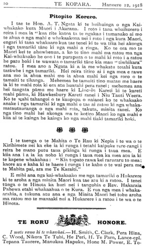 Pitopito Korero. I tae te Hon. A. T. Ngata ki te huihuinga o nga Kaiwhako kura Maori i Akarana. I roto i tana whaikorero i reira i mea ia " kua rite katoa ta te ngakau i tumanako ai mo te ahua o nga mahi e whakaakona nei i roto i nga kura Maori, engari ki tana whakaaro kua tae tenei ki te wa tika hei akonga i nga tamariki tane ki nga mahi a ringa. Ko te ora mo te Maori kei te ahuwhenua, a ko te tino mahi ma ratou ma nga Kai-whakaako he ono i te purapura o te mahi ki roto i a ratou he patu hoki i te wawata o tamariki tane kia mau "tiwhikara" ratou. I mea ano a Ngata ki a ia me whakatu tetahi kura tarawhe i nga tamariki. Hei reira titiro ai i nga mea e rawe ana mo ia ahua mahi mo ia ahua mahi kei nga roro o te tamaiti te tikanga. Mehemea he tamaiti tino matau me haere ia ki te mahi roia ki era atu huarahi pera ranei; mehemea ana hei tangata pamu me haere ki Lincoln Kareti ki te kareti mahi pamu, ki Hawkesbury Kareti ranei i Niu Tauti Weera. Ko te wahi tahangoi o te kaupapa o naianei ko te whakaako anake i nga tamariki ki nga mahi e tae ai ratou ki nga whakarnatautauranga o nga mahi roia, takuta, minita ranei. Ko nga tino mahi hei akonga ma te kotiro Maori ko nga mahi e kiia ai te kainga he kainga, ko nga mahi tiaki tamariki hoki. I te taenga o te Mahita o Te Rau ki Nepia i te wa o te Kirihimete nei ka eke ia ki runga i tetahi kaipuke rere-rangi i reira he mano putu taua pikinga ki runga i taua mea. E: kiia ana i a ia ka noho ki runga i taua mea ka mea atu ia ki te kapene whakahau: " Kia tupato rawa kei raruraru to mea; kaore au e kaha ki te haere i runga i te kahu o te wai pera me te Mahita pai, ara me Te Karaiti." E mihi ana nga kai-whakaako me ma tarnariki o Hukarere ki te aroha a nga minita Maori kua tae atu ki a ratou. I tenei tunga o te Hinota ka huri nei i tangohia e Rev. Hakaraia Pahewa etahi whakaahua o te Kura. E rua nga mea i whakaarahia, a tukuna atu ana e nga Minita Maori hei tohu aroha ma ratou mo te man,taki nui a Hukarere i a ratou i te wa o te Hinota. TE RORU HONORE. I mate rawa ki te whawhai. - H. Smith, C. Clark, Pera Hina, C. Wood, Nikora Te Tuhi, He Peri, H. Te Paro, Lance-cpl. Tepana Taurere, Manukau Hapuku, Hone M. Power, E. Toheriri,