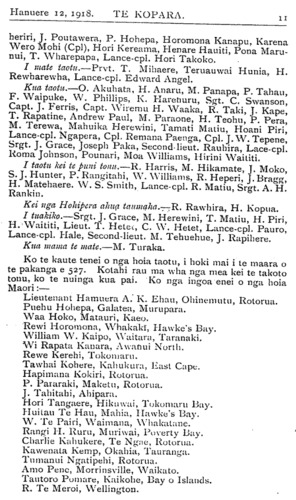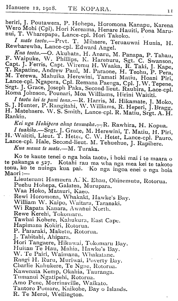 J. Poutawera, P. Hohepa, Horomona Kanapu, Karena Wero Mohi (Cpl), Hori Kereama, Henare Hauiti, Pona Marunui, T. Wharepapa, Lance-cpl. Hori Takoko. I mate taotu. - Prvt. T. Mihaere, Teruauwai Hunia, H. Rewharewha, Lance-cpl. Edward Angel. Kua taotu. - O. Akuhata, H. Anaru, M. Panapa, P. Tahau F. Waipuke, W. Phillips, K. Harehuru, Sgt. C. Swanson Capt. J. Ferris, Capt. Wiremu H. Waaka , R. Taki, J. Kape T. Rapatine, Andrew Paul, M. Paraone, H. Teohu, P. Pera M. Terewa, Mahuika Herewini, Tamati Matiu, Hoani Piri Lance-cpl. Ngapera, Cpl. Remana Paenga, Cpl. J. W. Tepene Srgt. J. Grace, Joseph Paka, Second-lieut. Rauhira, Lace-cpl Roma Johuson, Pounari, Moa Williams, Hirini Waititi. I taotu kei te puni tonu. - R. Harris, M. Hikamate, J. Moko S. J. Hunter, P. Rangitahi, W. Williams, R. Heperi, J. Bragg H. Matehaere. W. S. Smith, Lance-cpl. R. Matiu, Srgt. A. H. Rankin. Kei nga Hokipera ahua taumaha. R. Rawhira, H. Kopua. I tuakiko. - Srgt. J. Grace, M. Herewini, T. Matiu, H. Piri H. Waititi, Lieut. T. Hetet, C. W. Hetet, Lance-cpl. Pauro Lance-cpl. Hale, Second-lieut. M. Tehuehue, J. Rapihere. Kua mama te mate. - M. Turaka. Ko te kaute tenei o nga hoia taotu, i hoki mai i te maara o te pakanga e 527. Kotahi rau ma wha nga mea kei te takoto tonu, ko te nuinga kua pai. Ko nga ingoa enei o nga hoia Maori: - Lieutenant Hamuera A. K. Ehau, Ohinemutu, Rotorua. Puehu Hohepa, Galatea, Murupara. Waa Hoko, Matauri, Kaeo. Rewi Horomona, Whakaki, Hawke's Bay. William W. Kaipo, Waitara, Taranaki. Wi Rapata Kanara, Awanui North. Rewe Kerehi, Tokomaru. Tawhai Kohere, Kahukura, East Cape. Hapimana Kokiri, Rotorua. P. Pararaki, Maketu, Rotorua. J. Tahitahi, Ahipara. Hori Tangaere, Hikuwai, Tokomaru Bay. Huitau Te Hau, Mahia, Haweks Bay. W. Tre Pairi, Waimana, Wahakatane. Rangi H. Ruru, Muriwai, Poverty Bay. Charlie Kahukere, Te Ngae, Rotorua. Kawenata Kemp, Okahia, Tauranga. Tumanui Ngatipehi, Rotorua. Amo Pene, Morrinsville, Waikato. Tautoro Pomare, Kaikohe, Bay o Islands. R. Te Meroi, Wellington.