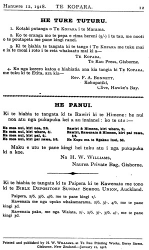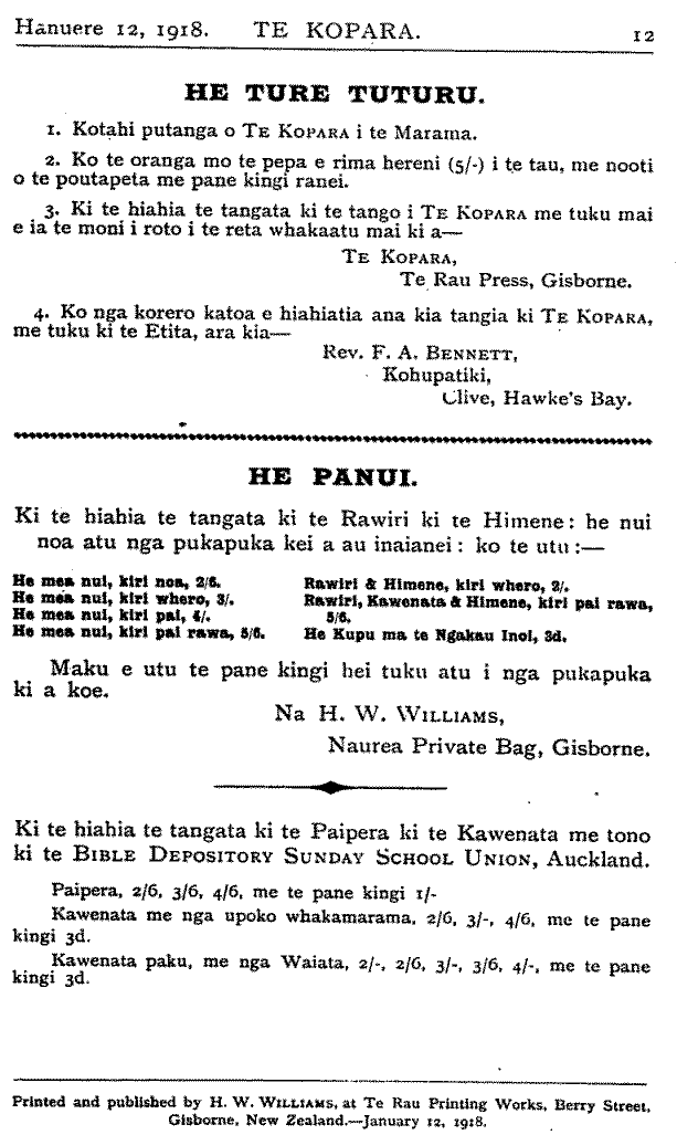 HE TURE TUTURU. 1. Kotahi putanga o TE KOPARA ki te Marama. 2. Ko te oranga mo te pepa e rima hereni (5/-) ki te tau, me nooti o te poutapeta me pane kingi ranei. 3. Ki te hiahia te tangata 2 te tango ki TE KOPARA me tuku mai e ia te moni ki roto ki te reta whakaatu mai ki a - TE KOPARA, Te Rau Press, Gisborne. 4. Ko nga korero katoa e hiahiatia ana kia tangia ki TE KOPARA, me taku ki te Etita, ara kia - Rev. F. A. BENNETT, Kohupatiki, Clive, Hawke's Bay. HE PANUI. Ki te hiahia te tangata ki te Rawiri ki te Himene: he nui noa atu nga pukapuka kei a au inaianei: ko te utu: - Ha mea nui, kiri noa, 2/6. Rawiri & Himene, kiri whero, 2/. He mea nui, kiri whero, 3/. Rawiri, Kawenata & Himene, kiri whero, 3/6. He mea nui, kiri pai, 4/. Rawiri, Kawenata & Himene, kiri pai rawa, 5/6. He mea nui, kiri pai rawa, 5/6. He Kupu ma te Ngakau Inoi, 3d. Maku e utu te pane kingi hei toku atu i nga pukapuka ki a koe. Na H. W. WILLIAMS, Naurea Private Bag, Gisborne. Ki te hiahia te tangata ki te Paipera ki te Kawenata me tono ki te BIBLE DEPOSITORY SUNDAY SCHOOL UNION, Auckland. Paipera. 2/6, 3/6, 4/6, me te pane kingi 1/- Kawenata me nga upoko whakamarama, 2/6, 3/-, 4/6, me te pane kingi 3d. Kawenata paku, me nga Waiata, 2/-, 2/6, 3/-, 3/6, 4/-, me te pane kingi 3d. Printed and published by H. W. WlLLIAMS, at Te Rau Printing Works, Berry Street, Gisborne, New Zealand. - January 12, 1918,