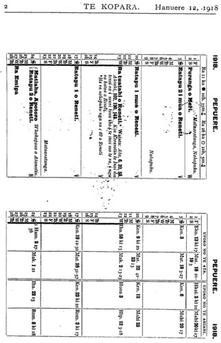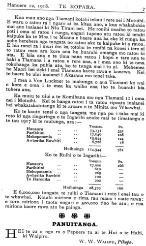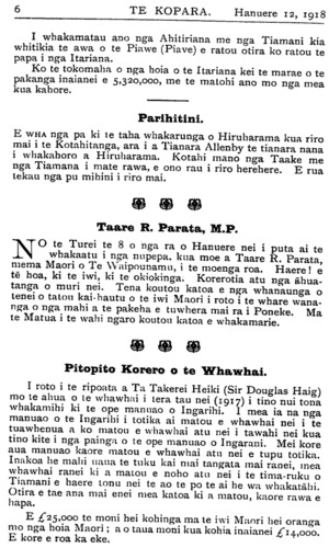 I whakamatau ano nga Ahitiriana me nga Tiamani kia whitikia te awa o te Piawe (Piave) te ratou otira ko ratou te papa i nga Itariana. Ko te tokomaha o nga hoia o te Itariana kei te marae o te pakanga inaianei te 5,320,000, me te matohi ano mo nga mea kua kahore. Parihitini. E WHA nga pa ki te taha whakarunga o Hiruharama kua riro mai i te Kotahitanga, ara i a Tianara Allenby te tianara nana i whakahoro a Hiruharama. Kotahi mano nga Taake me nga Tiamana i mate rawa te ono rau i riro herehere. te rua tekau nga pu mihini i riro mai. Taare R. Parata, M.P. No te Turei te 8 o nga ra o Hanuere nei i puta ai te whakaatu i nga nupepa kua moe a Taare R. Parata, mema Maori o Te Watipounamu, i te moenga roa. Haere ! te te hoa, ki te iwi, ki te okiokinga. Korerotia atu nga ahuatanga o muri nei. Tena koutou katoa te nga whanaunga o tenei o tatou kai-hautu o te iwi Maori i roto i te whare wananga o nga mahi a te pakeha te tuwhera mai ra i Poneke. Ma te Matua i te wahi ngaro koutou katoa te whakamarie. Pitopito Korero o te Whawhai. I roto i te ripoata a Ta Takerei Heiki (Sir Douglas Haig) mo te ahua o te whawhai i tera tau nei (1917) i tino nui tona whakamihi ki te ope manuao o Ingarihi. I mea ia na nga manuao o te Ingarihi i totika ai matou te whawhai nei i te tuawhenua a ko matou te whawhai atu nei i tawahi nei kua tino kite i nga painga o te ope manuao o Ingarani. Mei kore aua manuao kaore matou te whawhai atu nei te tupu totika. Inakoa he mahi uaua te tuku kai mai tangata mai ranei mea whawhai ranei ki a matou te noho atu nei i te tima-ruku o Tiamani te haere tonu nei te ao te po te ai he wa whakatahi. Otira te tae ana mai enei mea katoa ki a matou, kaore rawa e hapa. E £25,000 te moni hei kohinga ma te iwi Maori hei oranga mo nga hoia Maori; a o taua moni kua kohia inaianei £14,000. E kore e roa ka eke.