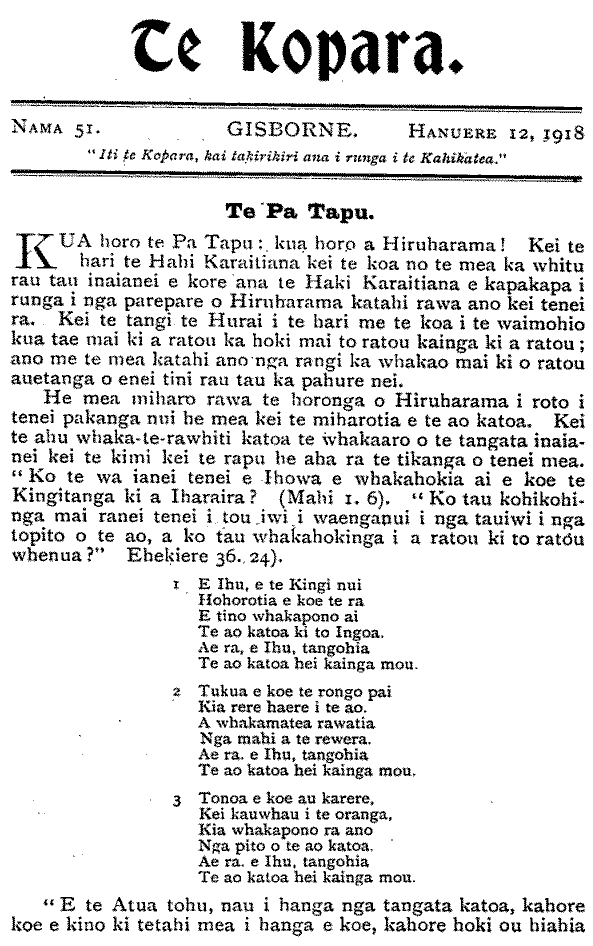 Te Kopara. NAMA 51. GISBORNE. HANUERE 12, 1918 "Iti te Kopara kai takirikiri ana i runga i te Kahikatea." Te Pa Tapu. KUA horo te Pa Tapu kua horo a Hiruharama ! Kei te hari te Hahi Karaitiana kei te koa no te mea ka whitu rau tau inaianei e kore ana te Haki Karaitiana e kapakapa i runga i nga parepare o Hiruharama katahi rawa ano kei tenei ra. Kei te tangi te Hurai i te hari me te koa i te waimohio kua tae mai ki a ratou ka hoki mai to ratou kainga ki a ratou ano me te mea katahi ano nga rangi ka whakao mai ki o ratou auetanga o enei tini rau tau ka pahure nei. He mea miharo rawa te horonga o Hiruharama i roto i tenei pakanga nui he mea kei te miharotia e te ao katoa. Kei te ahu whaka-terawhiti katoa te whakaaro o te tangata inaianei kei te kimi kei te rapu he aha ra te tikanga o tenei mea. " Ko te wa ianei tenei e Ihowa e whakahokia ai e koe te Kingitanga ki a Iharaira ? (Mahi I. 6). " Ko tau kohikohinga mai ranei tenei i tou iwi i waenganui i nga tauiwi i nga topito o te ao, a ko tau whakahokinga i a ratou ki to ratou whenua ?" Ehekiere 36. 24). 1 E Ihu, e te Kingi nui Hohorotia e koe te ra E tino whakapono ai Te ao katoa ki to Ingoa. Ae ra, e Ihu, tangohia Te ao katoa hei kainga mou. 2 Tukua e koe te rongo pai Kia rere haere i te ao. A whakamatea rawatia Nga mahi a te rewera. Ae ra. e Ihu, tangohia Te ao katoa hei kainga mou. 3 Tonoa e koe au karere Kei kauwhau i te oranga Kia whakapono ra ano Nga pito o te ao katoa. Ae ra. e Ihu, tangohia Te ao katoa hei kainga mou. "E te Atua tohu, nau i hanga nga tangata katoa, kahore koe e kino ki tetahi mea i hanga e koe, kahore hoki ou hiahia