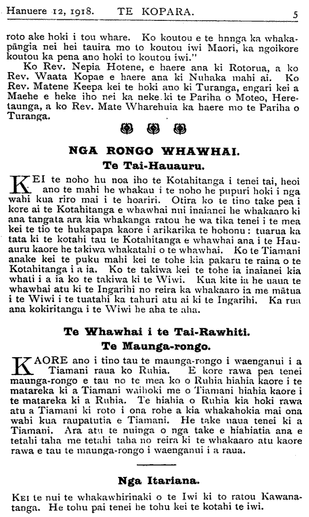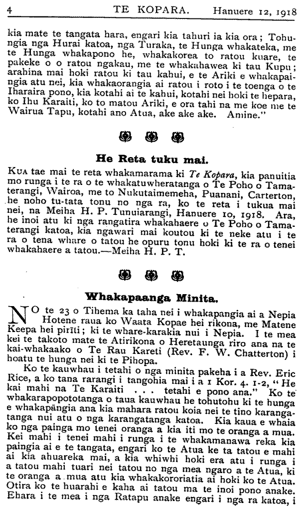 kia mate te tangata hara, engari kia tahuri ia kia ora; Tohungia nga Hurai katoa, nga Turaka, te Hunga whakateka, me te Hunga whakapono he, whakakorea to ratou kuare, te pakeke o o ratou ngakau, me te whakahawea ki tau Kupu arahina mai hoki ratou ki tau kahui, e te Ariki e whakapaingia atu nei, kia whakaorangia ai ratou i roto i te toenga o te Iharaira pono, kia kotahi ai te kahui, kotahi nei hoki te hepara ko Ihu Karaiti, ko to matou Ariki, e ora tahi na me koe me te Wairua Tapu, kotahi ano Atua, ake ake ake. Amine." He Reta tuku mai. KUA tae mai te reta whakamarama ki Te Kopara, kia panuitia mo runga i te ra o te whakatuwheratanga o Te Poho o Tamaterangi, Wairoa, me to Nukutaimemeha, Puanani, Carterton, he noho tu-tata tonu no nga ra, ko te reta i tukua mai nei, na Meiha H. P. Tunuiarangi, Hanuere 10, 1918. Ara, he inoi atu ki nga rangatira whakahaere o Te Poho o Tamaterangi katoa, kia ngawari mai koutou ki te neke atu i te ra o tena whare o tatou he opuru tonu hoki ki te ra o tenei whakahaere a tatou. - Meiha H. P. T. Whakapaanga Minita. No te 23 o Tihema ka taha nei i whakapangia ai a Nepia Hotene rana ko Waata Kopae hei rikona, me Matene Keepa hei piriti; ki te wharekarakia nui i Nepia. I te mea kei te takoto mate te Atirikona o Heretaunga riro ana na te kai-whakaako o Te Rau Kareti (Rev. F. W. Chatterton) i hoatu te hunga nei ki te Pihopa. Ko te kanwhau i tetahi o nga minita pakeha i a Rev. Eric Rice, a ko tana rarangi i tangohia mai i a 1 Kor. 4. 1-2, " He kai mahi na Te Karaiti ... tetahi e pono ana." Ko te whakarapopototanga o taea kanwhau he tohutohu ki te hunga e whakapangia ana kia mahara ratou koia nei te tino karangatanga nui atu o nga karangatanga katoa. Kia kaua e whaia ko nga painga mo tenei oranga a kia iti mo te oranga a mua. Kei mahi i tenei mahi i runga i te whakamanawa reka kia paingia ai e te tangata, engari ko te Atua ke ta tatou e mahi ai kia ahuareka mai, a kia whiwhi hoki era atu i runga i a tatou mahi tuari nei tatou no nga mea ngaro a te Atua, ki te oranga a mua. atu kia whakakororiatia ai hoki ko te Atua. Otira ko te huarahi e kaha ai tatou ma te inoi pono anake. Ehara i te mea i nga Ratapu anake engari i nga ra katoa, i