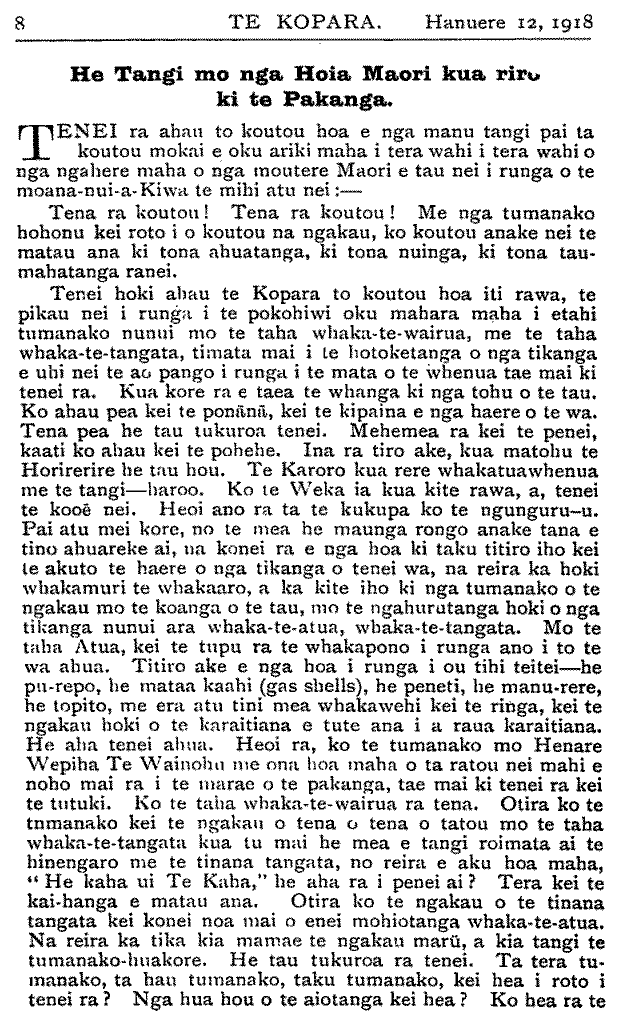He Tangi mo nga Hoia Maori kua riro ki te Pakanga. TENEI ra ahau to koutou hoa e nga manu tangi pai ta koutou mokai e oku ariki maha i tera wahi i tera wahi o nga ngahere maha o nga moutere Maori e tau nei i runga o te moana-nui-a-Kiwa te mihi atu nei: - Tena ra koutou! Tena ra koutou! Me nga tumanako hohonu kei roto i o koutou na ngakau, ko koutou anake nei te matau ana ki tona ahuatanga, ki tona nuinga, ki tona taumahatanga ranei. Tenei hoki ahau te Kopara to koutou hoa iti rawa, te pikau nei i runga i te pokohiwi oku mahara maha i etahi tumanako nunui mo te taha whaka-tewairua, me te taha whaka-te-tangata, timata mai i te hotoketanga o nga tikanga e uhi nei te ao pango i runga i te mata o te whenua tae mai ki tenei ra. Kua kore ra e taea te whanga ki nga tohu o te tau. Ko ahau pea kei te ponana, kei te kipaina e nga haere o te wa. Tena pea he tau tukuroa tenei. Mehemea ra kei te penei, kaati ko ahau kei te pohehe. Ina ra tiro ake, kua matohu te Horirerire he tau hou. Te Karoro kua rere whakatuawhenua me te tangi - haroo. Ko te Weka ia kua kite rawa, a, tenei te kooe nei. Heoi ano ra ta te kukupa ko te ngunguru-u. Pai atu mei kore, no te mea he maunga rongo anake tana e tino ahuareke ai, na konei ra e nga hoa ki taku titiro iho kei te akuto te haere o nga tikanga o tenei wa, na reira ka hoki whakamuri te whakaaro, a ka kite iho ki nga tumanako o te ngakau mo te koanga o te tau, mo te ngahurutanga hoki o nga tikanga nunui ara whakate-atua, whaka-te-tangata. Mo te taha Atua, kei te tupu ra te whakapono i runga ano i to te wa ahua. Titiro ake e nga hoa i runga i ou tihi teitei - he pu-repo, he mataa kaahi (gas shells), he peneti, he manu-rere, he topito, me era atu tini mea whakawehi kei te ringa, kei te ngakau hoki o te karaitiana e tute ana i a raua karaitiana. He aha tenei ahua. Heoi ra, ko te tumanako mo Henare Wepiha Te Wainohu me ona hoa maha o ta ratou nei mahi e noho mai ra i te marae o te pakanga, tae mai ki tenei ra kei te tutuki. Ko te taha whaka-te-wairua ra tena. Otira ko te tumanako kei te ngakau o tena o tena o tatou mo te taha whaka-te-tangata kua tu mai he mea e tangi roimata ai te hinengaro me te tinana tangata, no reira e aku hoa maha, " He kaha ui Te Kaha," he aha ra i penei ai ? Tera kei te kai-hanga e matatu ana. Otira ko te ngakau o te tinana tangata kei konei noa mai o enei mohiotanga whaka-te-atua, Na reira ka tika kia mamae te ngakau maru, a kia tangi te tumanako-huakore. He tau tukuroa ra tenei. Ta tera tu manako, ta hau tumanako, taku tumanako, kei hea i roto I tenei ra ? Nga hua hou o te aiotanga kei hea ? Ko hea ra te