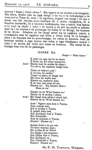 marae i hapa i tenei aitua ? Ka ngaro ra te momo o te tangata. Na reira, waiho ake ra nga tangi o te wa o te toitutanga o te wao-nui-a-Tane ki roto i te ngakau, engari me tangi i te reo o tenei wa hei whaka-mau-mahara ki o tatou rangatira, ki a koutou tamariki, ki a koutou mokopuna, me o tatou hoa katoa e tu mai ra etahi i roto i te mura o te ahi ko etahi e takoto mai ra i te marae o te pakanga he koha ki te Kingi, he honore ki te Atua. Ahakoa ra he tangi tenei na te ngakau maru, e tumanako ana te ngakau me kore e whai koha ki te hunga i roto i te mamae me te pouritanga, no reira to koutou hoa, ta koutou mokai e nga manu reo reka, e nga whakaaro nunui i roto i te aroha ka mihi atu tena ra koutou. He tangi ki te hunga kua riro ki te pakanga. HAERE RA. Rangi - " Blue Eyes." E pari ra nga tai ki te akau E hotu ra, ko taku manawa. Aue! Haria mai te aroha ki ahau; Te iwi e, he ngakau tangi noa. Tena ra tahuri mai! E te tau, te aroha! Tenei ra ahau te tangi nei Mo hou ka wehe nei. Haere ra, mahara mai, E te tau, kia mau ki au. Haere ra! Ka tuturu ahau: Hae-re ra! Haere ra te Wiwi haere ra ! Haria ra te aroha i ahau Aue! Me tangi noa ahau i muri nei. Haere ra te Wiwi haere ra ! Aue! Ngaro noa koe e Tama, Nga marae nei. Ko te aroha e Tama E peehi kino nei. Kei Karipori koe e Tama Kei Paranihi. Aue te mamae e Tama. Haere! Haere ra ! Kaore hoki e te po nei Te heri wairua mai: He aroha ki te Wiwi Ka hinga i pa-mamao. Kei Ihipa koe e Tama, Kei Karipori ra ; Kei Paranihi e Tama. Haere! Haere ra! Na P. H. TOMOANA, Waipatu.