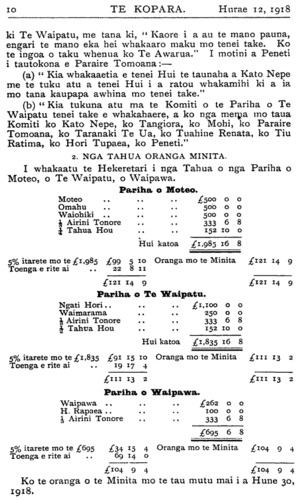 ki Te Waipatu, me tana ki, "Kaore i a au te mano pauna, engari te mano eka hei whakaaro maku mo tenei take. Ko te ingoa o taku whenua ko Te Awarua." I motini a Peneti i tautokona e Paraire Tomoana: - (a) "Kia whakaaetia e tenei Hui te taunaha a Kato Nepe me te tuku atu a tenei Hui i a ratou whakamihi ki a ia mo tana kaupapa awhina mo tenei take." (b) "Kia tukuna atu ma te Komiti o te Pariha o Te Waipatu tenei take e whakahaere, a ko nga mema mo taua Komiti ko Kato Nepe, ko Tangiora, ko Mohi, ko Paraire Tomoana, ko Taranaki Te Ua, ko Tuahine Renata, ko Tiu Ratima, ko Hori Tupaea, ko Peneti." 2. NGA TAHUA ORANGA MINITA. I whakaatu te Hekeretari i nga Tahua o nga Pariha o Moteo, o Te Waipatu, o Waipawa. Pariha o Moteo. Moteo £500 0 0 Omahu 500 0 0 Waiohik 500 0 0 1/8Airini Tonore 333 6 8 1/4Tahua Hou 152 10 0 Hui katoa £1,985 16 8 5% itarete mo te £1,985 £99 5 10 Toenga e rite ai 22 8 11 £121 14 9 Oranga mo te Minita £121 14 9 £121 14 9 Pariha o Te Waipatu. Ngati Hori £1,100 0 0 Waimarama 250 0 0 1/3Airini Tonore 333 6 8 1/2 Tahua Hou 152 10 0 Hui katoa £1,835 16 8 5% itarete mo te £1,835 £91 15 10 Toenga e rite ai 19 17 4 £111 13 2 Oranga mo te Minita £111 13 2 £111 13 2 Pariha o Waipawa. Waipawa £262 0 0 H. Rapaea 100 0 0 1/3 Airini Tonore 333 6 8 £695 6 8 5% itarete mo te £695 £34 15 4 Toenga e rite ai 69 14 0 £104 9 4 Oranga mo te Minita £104 9 4 £104 9 4 Ko te oranga o te Minita mo te tau mutu mai i a Hune 30, 1918.