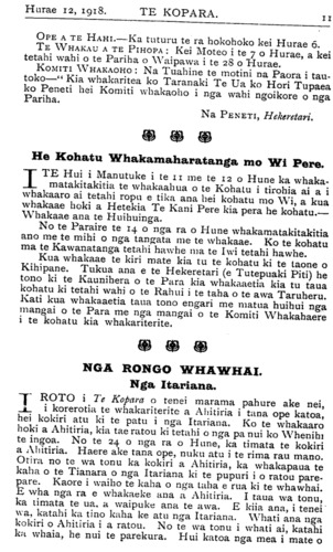OPE A TE HAHI. - Ka tuturu te ra hokohoko kei Hurae 6. TE WHAKAU A TE PIHOPA: Kei Moteo i te 7 o Hurae, a kei tetahi wahi o te Pariha o Waipawa i te 28 o Hurae. KOMITI WHAKAOHO: Na Tuahine te motini na Paora i tautoko - "Kia whakaritea ko Taranaki Te Ua ko Hori Tupaea ko Peneti hei Komiti whakaoho i nga wahi ngoikore o nga Pariha. Na PENETI, Hekeratari. He Kohatu Whakamaharatanga mo Wi Pere. ITE Hui i Manutake i te 11 me te 12 o Hune ka whakamatakitakitia te whakaahua o te Kohatu i tirohia ai a i whakaaro ai tetahi ropu e tika ana hei kohatu mo Wi, a kua whakaae hoki a Hetekia Te Kani Pere kia pera he kohatu. - Whakaae ana te Huihuinga. No te Paraire te 14 o nga ra o Hune whakamatakitakitia ano me te mihi o nga tangata me te whakaae. Ko te kohatu ma te Kawanatanga tetahi hawhe ma te Iwi tetahi hawhe. Kua whakaae te kiri mate kia tu te kohatu ki te taone o Kihipane. Tukua ana e te Hekeretari (e Tutepuaki Piti) he tono ki te Kaunihera o te Para kia whakaaetia kia tu taua kohatu ki tetahi wahi o te Rahui i te taha o te awa Taruheru. Kati kua whakaaetia taua tono engari me matua huihui nga mangai o te Para me nga mangai o te Komiti Whakahaere te kohatu kia whakariterite. NGA RONGO WHAWHAI. Nga Itariana. I ROTO i Te Ko,bara o tenei marama pahure ake nei, i korerotia te whakariterite a Ahitiria i tana ope katoa hei kokiri atu ki te patu i nga Itariana. Ko te whakaaro hoki a Ahitiria, kia tae ratou ki tetahi o nga pa nui ko Whenihi te ingoa No te 24 o nga ra o Hune, ka timata te kokiri a Ahitiria Haere ake tana ope, nuku atu i te rima rau mano. Otira no te wa tonu ka kokiri a Ahitiria, ka whakapana te kaha o te Tianara o nga Itariana ki te pupuri i o ratou pare pare. Kaore i waiho te waha o nga taha e rua ki te whawhai. E wha nga ra e whakaeke ana a Ahitiria. I taua wa tonu, ka timata te ua a waipuke ana te awa. E kiia ana, i tenei wa, katahi ka tino kaha ke atu nga Itariana. Whati ana nga kokiri o Ahitiria i a ratou. No te wa tonu i whati ai, katahi ka whaia, he nui te parekura. Hui katoa nga mea i mate o