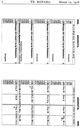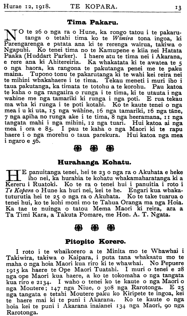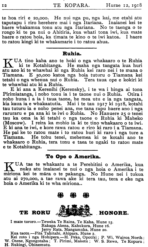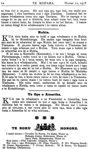 Nama 57. Hurae 12, 1918. Te Kopara Registered at the G.P.O, as a Newspaper. Te Oranga mo tenei Pepa e Rima Kereni mo te Tau