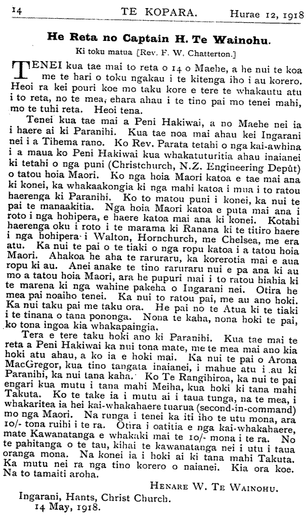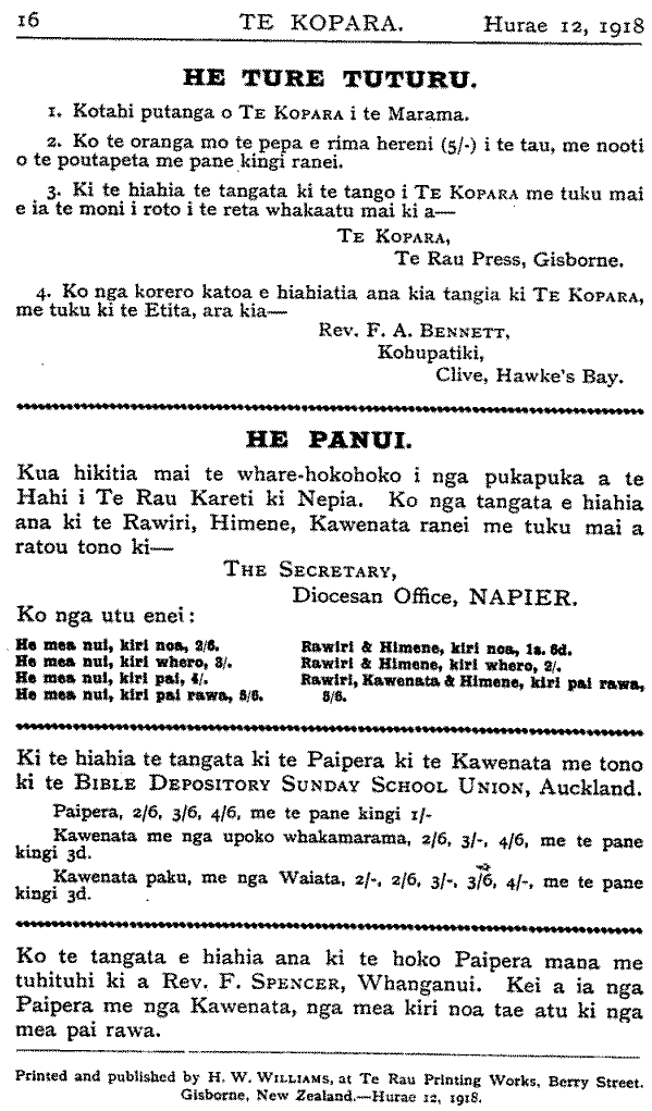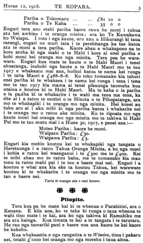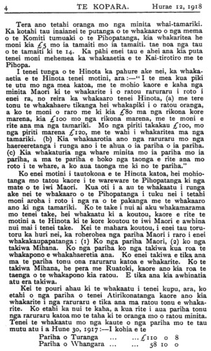 Pariha o Turanga £110 0 8 Pariha o Whangara 58 10 0 Pariha o Tokomaru £81 10 0 Pariha o Te Kaha 35 0 0 Engari tera ano etahi pariha kaore rawa he moni i tukua atu hei awhina i te oranga minita ara ko Te Kawakawa ko Waiapu I roto i nga kaute, uru ana a Hikurangi ki taua rarangi, engari no muri tata i te perehitanga ka tae katoa atu te moni a tera pariha. Kaore ahau e whakapono na te kore aroha ki nga mahi o te Hahi i kore ai enei pariha e kohi moni hei oranga mo nga minita. Tera pea he wareware. Engari kua mate te kaute o te Hahi Maori i tenei ahuatanga inahoki nga kaute a te Hahi Maori mo te tau 1917 e whakaatu mai ana, huihui katoa te nama kei runga te taha Maori e £488-8-8. Ko toku tumanako kia tahuri enei pariha ki te whakaea i te nama kei runga i tena i tena mo te tau 1917 kia mama ai tenei pikaunga taumaha kua utaina e koutou ki te Hahi Maori. Ma te kaha o ia pariha o ia panuiha ki te whakarite i te wahi ma tena ma tena, ka rite ai i a tatou te motini o te Hinota o te Pihopatanga, ara mo te whakapiki i te oranga mo nga minita. Hei konei au tuku atu ai i aku mihi ki nga pariha katoa i whakarite nei i te oranga mo o ratou ake minita. Ko te ripoata mo nga kaute moni hei oranga mo nga minita mo te takiwa ki Haki Pei mo te tau mutu mai i a Hune 30, 1917, e penei ana: - Moteo Pariha: kaore he moni, Waipatu Pariha: £30 Waipawa Pariha: £5. Engari kia mohio koutou kei te whakapiki nga tangata o Heretaunga i a ratou Tahua Oranga Minita, a ko nga moni i kohia e ratou kei waenganui i te £300 me te £400. Kei te mihi ahau mo to ratou kaha, me te tumanako kia mau tonu ta ratou mahi pai i te tau e haere mai nei. Engari i a koutou e whai ana kia eke ta koutou Tahua, kei wareware koutou ki te whakarite i te oranga mo nga minita mo te tau e haere nei. Taria te roanga atu o enei korero. Pitopito. Tera kua pa he mate kai ki te whenua o Parahitini, ara o Kenana. E kiia ana, ko te taha ki runga o taua whenua te wahi tino mate i te kai, ara ko nga takiwa ki Ramahiku me era atu kainga. Kua timata te kai a te tangata i te tarutaru. He rau nga tamariki pani e haere noa ana kaore he kai kaore he kakahu. Kua whakaaetia e nga rangatira o te Wimira tima i pakaru nei, tetahi £1000 hei oranga mo nga morehu i taua aitua,