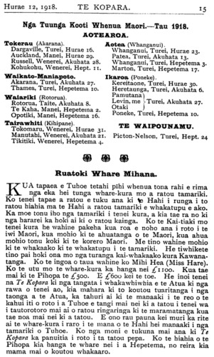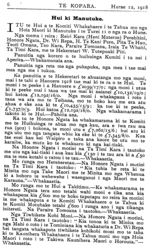 Hui ki Manutuke. ITU te Hui a te Komiti Whakahaere i te Tahua mo nga Hoia Maori ki Manutuke i te Turei 11 o nga ra o Hune. Nga mema i reira: Reiri Kara (Heni Materoa) Perehitini, Honore Ngata, Dr. Wi Repa, H. Te Kani Pere, Pita Te Hau, Teoti Omana, Teo Kara, Paraire Tomoana, Iraia Te Whaiti, Ta Timi Kara, me te Hekeretari W. Tutepuaki Piti. Panuitia nga korero o te huihuinga Komiti i tu nei i Aperira. - Whakamanaia ana. Panuitia nga reta me nga pukapaka, nga mea i tae mai mea nga me i tukua. Ka panuitia e te Hekeretari te ahuatanga mo nga moni, mai i te tahi o Hanuere 1918 tae mai ki te ra o te Hui. Te moni i te peeke i a Hanuere e £2059/17/0; nga moni i utua ki te peeke mai i taua wa tae mai ki naianei £10,132/19/0; katoa £12,192/16/0. Nga moni i whakapaua i roto i taua wa ara mo te Teihana, mo te hoko kau me era atu ahua e eke ana ki te £10,455/15/9; ka toe ki te peeke, £I,737/0/3. Hui katoa £12,192/16/0. Nga whakamarama i takoto ki te Hui. - Pahitia ana. Ka tu te Honore Ngata ka whakamarama ki te Komiti me te Huihuinga te ahua mo nga kau, ara e iwa rau ma rua (902) i hokona, te moni utu e £7,262/I5/6; hui atu ki nga utu mo nga tangata whiu ka eke ki te £7,345/8/0. Kua tae enei kau kei Waipiro e taka ana kaore he utu mo te karaihe, ka mutu ko te whakaaro ki nga kai-tiaki. Na Honore Ngata i motini na Ta Timi Kara i tautoko me utu nga kai-tiaki i aua kau kia £150 i te tau ara ki a £50 ma te mea kotahi o ratou i te tau. - Whakaaetia. Mo runga mo Hereheretau. - Na Honore Ngata i motini na Ta Timi Kara i tautoko: " Kia tuhia he reta ki te Minita mo nga Take Maori me te Minita mo nga Whenua ki a hohoro te wehewehe i waenganui i nga Maori me te Karauna." - Whakaaetia. Mo runga mo te Hui a Takitimu. - Ka whakamarama te Honore Ngata tera ano tetahi wahi moni e tika ana kia whakapaua kia £600 mo te hoko taputapu no reira ka motini ia me whakaputa e te Komiti Whakahaere o te Tahua ki te Komiti Motuhake tetahi £600 i runga ano i nga tikanga initereti. Na Paraire Tomoana i tautoko. - Whakaaetia. Nga Tiwhikete Kohi Moni. - Na Honore Ngata i motini, na Ta Timi Kara i tautoko: " Kia tonoa ki te Minita mo nga Mahi o roto i te Tominiana kia whakaturia a Dr. Wi Repa hei tangata whakaputa tiwhikete kohikohi moni mo te taha ki te Kaunihera Whakahaere i te Tahua moni mo nga Hoia Maori i roto i te Takiwa Kaunihera Maori o Horouta." - Whakaaetia,