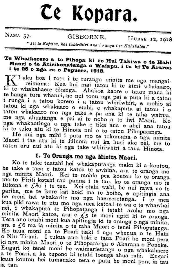 Te Kopara. NAMA 57. GISBORNE. HURAE 12, 1918 "Iti te Kopara, kai takirikiri ana i runga i te Kahikatea." Te Whaikorero a te Pihopa ki te Hui Takiwa o te Hahi Maori o te Atirikonatanga o Waiapu i tu ki Te Araroa i te 26 o nga ra o Pepuere, 1918. KI aku hoa i roto i te turanga minita me nga mangaireimana : Kua hui mai tatou ki te kimi whakaaro, ki te whakahaere tikanga. Ahakoa kaore o tatou mana ki te hanga ture whanui, he nui tonu nga pai e puta ki a tatou i runga i a tatou korero i a tatou whiriwhiri, e mohio ai tatou ki nga whakaaro o etahi, e whakaputa ai tatou i o tatou whakaaro mo nga take e pa ana ki te taha wairua, me nga ahuatanga e pai ai te noho a te iwi Maori. Ko nga whakaotinga o nga take e tika ana e ahei ana tatou ki te tuku atu ki te Hinota nui o to tatou Pihopatanga. He nui nga mihi i puta mo te tokomaha o nga minita Maori i tae atu ki te Hinota nui ka huri ake nei, me to ratou uru nui atu ki nga take whiriwhiri a taua Hinota. 1. Te Oranga mo nga Minita Maori. Ko te take tuatahi hei whakaputanga maku ki a koutou, he take e taea e tatou katoa te awhina, ara te oranga mo nga minita Maori. Kei te mohio pea koutou ko te oranga mo te Piriti kotahi rau pauna i te tau, ko te oranga mo te Rikona e £80 i te tau. Kei etahi wahi, he nui rawa no te pariha, me te kore kai hoki ma te hoiho, e apitingia ana he moni hei whakarite mo nga haereeretanga. I te mea kua piki rawa te utu mo nga mea katoa i te wa o te whawhai nei, i whakaputa te Pihopatanga i tetahi aroha mo nga minita Maori katoa, ara e £5 te moni apiti ki te oranga. Tera ano tetahi moni kua apitingia ki te oranga o nga minita, ara e £6 ma ia minita o te taha Maori o tenei Pihopatanga. Ko taua moni na te Poari tiaki i nga whenua o te Hahi o Niu Tirani. I tukua ano hoki e taua Poari he moni pera ki nga minita Maori o te Pihopatanga o Akarana o Poneke. Engari ko tenei moni he waimarietanga o nga whakahaere a te Poari, a ka tupono ki tetahi toenga ahua rahi. Engari kaua koutou hei tumanako tera e puta he moni pera ia tau ia tau.
