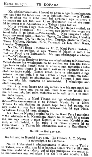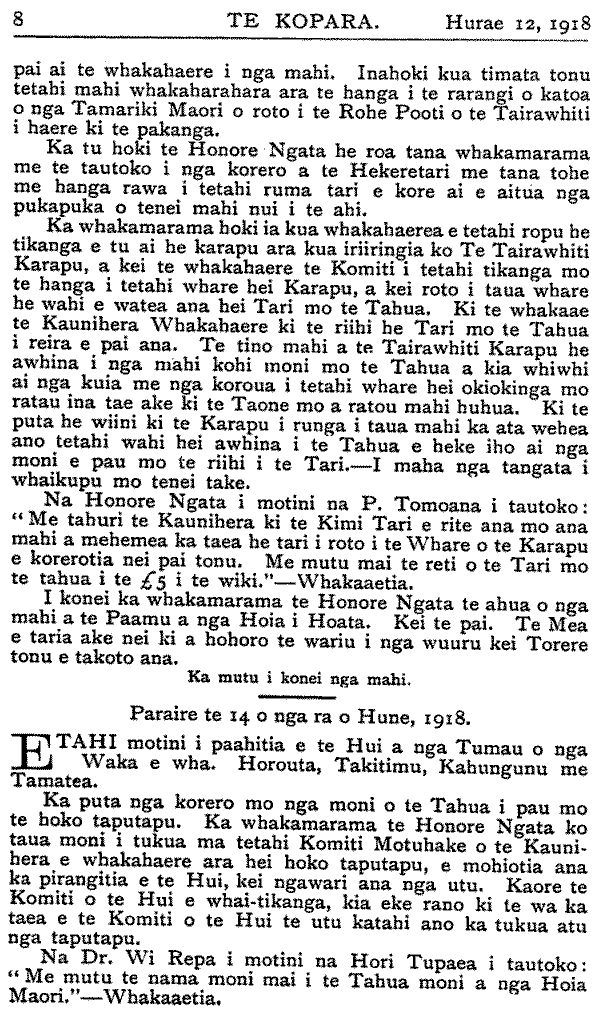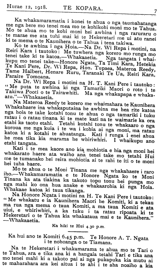pai ai te whakahaere i nga mahi. Inahoki kua timata tonu tetahi mahi whakaharahara ara te hanga i te rarangi o katoa o nga Tamariki Maori o roto i te Rohe Pooti o te Tairawhiti i haere ki te pakanga. Ka tu hoki te Honore Ngata he roa tana whakamarama me te tautoko i nga korero a te Hekeretari me tana tohe me hanga rawa i tetahi ruma tari e kore ai e aitua nga pukapuka o tenei mahi nui i te ahi. Ka whakamarama hoki ia kua whakahaerea e tetahi ropu he tikanga e tu ai he karapu ara kua iriiringia ko Te Tairawhiti Karapu, a kei te whakahaere te Komiti i tetahi tikanga mo te hanga i tetahi whare hei Karapu, a kei roto i taua whare he wahi e watea ana hei Tari mo te Tahua. Ki te whakaae te Kaunihera Whakahaere ki te riihi he Tari mo te Tahua i reira e pai ana. Te tino mahi a te Tairawhiti Karapu he awhina i nga mahi kohi moni mo te Tahua a kia whiwhi ai nga kuia me nga koroua i tetahi whare hei okiokinga mo ratau ina tae ake ki te Taone mo a ratou mahi huhua. Ki te puta he wiini ki te Karapu i runga i taua mahi ka ata wehea ano tetahi wahi hei awhina i te Tahua e heke iho ai nga moni e pau mo te riihi i te Tari. - I maha nga tangata i whaikupu mo tenei take. Na Honore Ngata i motini na P. Tomoana i tautoko: " Me tahuri te Kaunihera ki te Kimi Tari e rite ana mo ana mahi a mehemea ka taea he tari i roto i te Whare o te Karapu e korerotia nei pai tonu. Me mutu mai te reti o te Tari mo te tahua i te Ł5 i te wiki." - Whakaaetia. I konei ka whakamarama te Honore Ngata te ahua o nga mahi a te Paamu a nga Hoia i Hoata. Kei te pai. Te Mea e taria ake nei ki a hohoro te wariu i nga wuuru kei Torere tonu e takoto ana. Ka mutu i konei nga mahi. Paraire te 14 o nga ra o Hune, 1918 ETAHI motini i paahitia e te Hui a nga Tumau o nga Waka e wha. Horouta, Takitimu, Kahungunu me Tamatea. Ka puta nga korero mo nga moni o te Tahua i pau mo te hoko taputapu. Ka whakamarama te Honore Ngata ko taua moni i tukua ma tetahi Komiti Motuhake o te Kaunihera e whakahaere ara hei hoko taputapu, e mohiotia ana ka pirangitia e te Hui, kei ngawari ana nga utu. Kaore te Komiti o te Hui e whai-tikanga, kia eke rano ki te wa ka taea e te Komiti o te Hui te utu katahi ano ka tukua atu nga taputapu. Na Dr. Wi Repa i motini na Hori Tupaea i tautoko: "Me mutu te nama moni mai i te Tahua moni a nga Hoia Maori." - Whakaaetia.