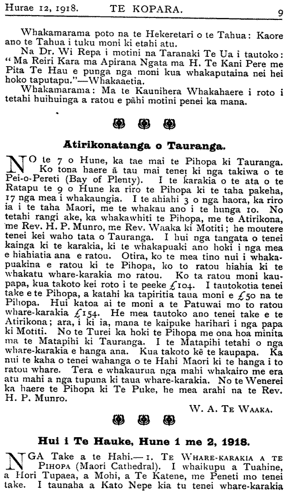 Whakamarama poto na te Hekeretari o te Tahua: Kaore ano te Tahua i tuku moni ki etahi atu. Na Dr. Wi Repa i motini na Taranaki Te Ua i tautoko: "Ma Reiri Kara ma Apirana Ngata ma H. Te Kani Pere me Pita Te Hau e punga nga moni kua whakaputaina nei hei hoko taputapu." - Whakaaetia. Whakamarama: Ma te Kaunihera Whakahaere i roto i tetahi huihuinga a ratou e pahi motini penei ka mana. Atirikonatanga o Tauranga. NO te 7 o Hune, ka tae mai te Pihopa ki Tauranga. Ko tona haere a tau mai tenei ki nga takiwa o te Pei-o-Pereti (Bay of Plenty). I te karakia o te ata o te Ratapu te 9 o Hune ka riro te Pihopa ki te taha pakeha, 17 nga mea i whakaungia. I te ahiahi 3 o nga haora, ka riro ia i te taha Maori, me te whakau ano i te hunga 10. No tetahi rangi ake, ka whakawhiti te Pihopa, me te Atirikona, me Rev. H. P. Munro, me Rev. Waaka ki Motiti; he moutere tenei kei waho tata o Tauranga. I hui nga tangata o tenei kainga ki te karakia, ki te whakapuaki ano hoki i nga mea e hiahiatia ana e ratou. Otira, ko te mea tino nui i whakapuakina e ratou ki te Pihopa, ko to ratou hiahia ki te whakatu wharekarakia mo ratou. Ko ta ratou moni kaupapa, kua takoto kei roto i te peeke £104. I tautokotia tenei take e te Pihopa, a katahi ka tapiritia taua moni e £50 na te Pihopa. Hui katoa ai te moni a te Patuwai mo to ratou whare-karakia £154. He mea tautoko ano tenei take e te Atirikona; ara, i ki ia, mana te kaipuke harihari i nga papa ki Motiti. No te Turei ka hoki te Pihopa me ona hoa minita ma te Matapihi ki Tauranga. I te Matapihi tetahi o nga whare-karakia e hanga ana. Kua takoto ke te kaupapa. Ka nui te kaha o tenei wahanga o te Hahi Maori ki te hanga i to ratou whare. Tera e whakaurua nga mahi whakairo me era atu mahi a nga tupuna ki taua whare-karakia. No te Wenerei ka haere te Pihopa ki Te Puke, he mea arahi na te Rev. H. P. Munro. W. A. TE WAAKA. Hui i Te Hauke, Hune 1 me 2,1918 NGA Take a te Hahi. - I. TE WHARE-KARAKIA A TE PIHOPA (Maori Cathedral). I whaikupu a Tuahine, a Hori Tupaea, a Mohi, a Te Katene, me Peneti mo tenei take. I taunaha a Kato Nepe kia tu tenei whare-karakia