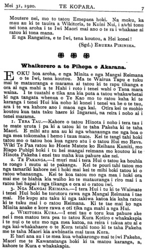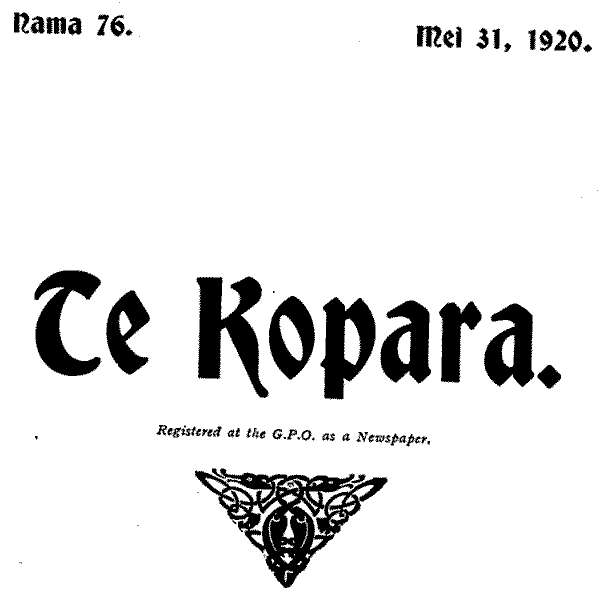 Rama 76. mei 31, 1920. Te Kopara. Registered at the G.P.O. as a Newspaper. Te oranga mo tenei pepa e Rima Kereni mo te Tau.