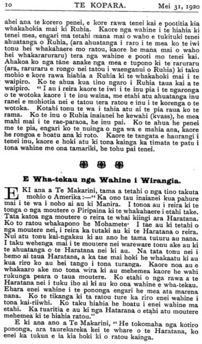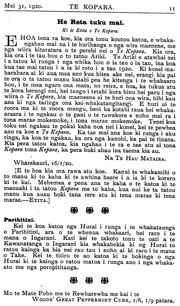 He Reta tuku mai. Ki te Etita o Te Kopara. E HOA tena ra koe, kia ora tonu koutou katoa, e whakangahau mai na i te hurihanga o nga wira maenene, me nga wiira kitaratara o te perehi nei o Te Kopara. Kia ora, kia ora i te tau hou o to tatou Ariki. Te Ariki e atawhai nei a tatou ki runga i nga whika hou o ia tau o ia tau, ina koa kua tae mai tatou i a ia ki roto i a tau 1920. Ki konei maharahara ai ki aua mea ano kua kitea ake nei, erangi kia pai te ora o ta tatou manu katahi pea he kitenga i te whakaaro hou, i te mea ngaro ona mata, no reira, e hoa, ka tukua atu te kora herengi nei, hei tango i tetahi kora hinu hei paru i nga wiira o Te Kopara, kia maeneene ai te huri ona wira, hihi kau ana ki nga taringa ona kai-whakatangitangi. E huri ai te roora ma ki te roora mangu, heoi ka kotahi raua hei whakaaraara i te ngakau o te pani o te rawakore e noho mai ra i tona marae mokemoke, i tona marae mokemoke. Tenei koa toku nei ngakau te pokai kaha noa nei i konei, kei te pewhea ano ra koe e Te Kopara. Ka tae mai ana koe ki runga i aku ringa, ka koa te ngakau, ka ora nga kanohi, ka pai te tinana. Kia pera tatou katoa, kia ngahau i te ra e tae atu ai tona Kopara tona Kopara, ka pera hoki ahau ina taema kia au. Na TE HAU MATAIRA. Wharekauri, 16/1/20. [E te hoa kia ora rawa atu koe. Kanui te whakamihi o to manu ki to kaha ki te awhina haere i a ia ki te korero ki te kai. Mehemea e pena ana te kaha o te katoa ki te manaaki i ta tatou Kopara me to kaha, kua nui ke ta tatou manu kua auau hoki tana rere atu ki tena marae ki tena marae. - ETITA.] Parihitini. Kei te koa katoa nga Hurai i runga i te whakataunga o Parihitini, ara o te whenua whakaari, hei raro i te mana o Ingarani. Kati kei te takoto tonu te oati a te Kawanatanga o Ingarani kia whakahokia ki ng Hurai to ratou kainga ka hia nei rau tau i noho ai ki raro i te mana o Take. Kei te titiro te ao katoa ki te hokinga o nga Hurai ki te kainga o ratou matua i runga ano i nga whakaatu me nga poropititanga. Mo te Mate Poho me te Rewharewha me kai i te WOODS' GREAT PEPPERMINT CURE, 1/6, 1/9 patara.
