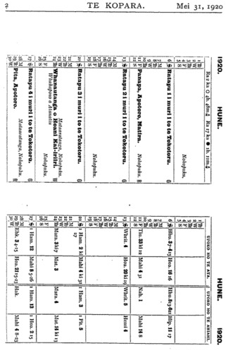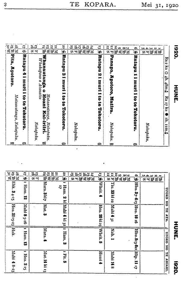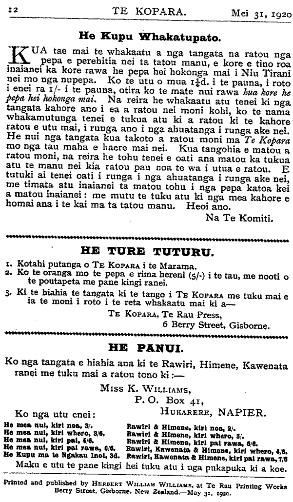 He Kupu Whakatupato. KUA tae mai te whakaatu a nga tangata na ratou nga pepa e perehitia nei ta tatou manu, e kore e tino roa inaianei ka kore rawa he pepa hei hokonga mai i Niu Tirani nei mo nga nupepa. Ko te utu o mua 11/4d. i te pauna, i roto i enei ra 1/- i te pauna, otira ko te mate nui rawa kua kore he pepa hei hokonga mai. Na reira he whakaatu atu tenei ki nga tangata kahore ano i ea a ratou nei moni kohi, ko te nama whakamutunga tenei e tukua atu ki a ratou ki te kahore ratou e utu mai, i runga ano i nga ahuatanga i runga ake nei. He nui nga tangata kua takoto a ratou moni ma Te Kopara mo nga tau maha e haere mai nei. Kua tangohia e matou a ratou moni, na reira he tohu tenei e oati ana matou ka tukua atu te manu nei kia ratou pau noa te wa i utua e ratou. E tutuki ai tenei oati i runga i nga ahuatanga i runga ake nei, me timata atu inaianei ta matou tohu i nga pepa katoa kei a matou inaianei: me mutu te tuku atu ki nga mea kahore e homai ana i te kai ma ta tatou manu. Heoi ano. Na Te Komiti. HE TURE TUTURU. 1. Kotahi putanga o TE KOPARA i te Marama. 2. Ko te oranga mo te pepa e rima hereni (5/-) i te tau, me nooti o te poutapeta me pane kingi ranei. 3. Ki te hiahia te tangata ki te tango i TE KOPARA me tuku mai e ia te moni i roto i te reta whakaatu mai ki a TE KOPARA, Te Rau Press, 6 Berry Street. Gisborne. HE PANUI. Ko nga tangata e hiahia ana ki te Rawiri, Himene, Kawenata ranei me tuku mai a ratou tono ki: MISS K. WILLIAMS, P. O. Box 41, HUKARERE, NAPIER. Ko nga utu enei: He mea nui, kiri noa, 3/. Rawiri & Himene kiri noa, 2/. He mea nui, kiri whero, 3/6. Rawiri & Himene kiri whero, 3/. He mea nui, kiri pai, 4/6. Rawiri & Himene, kiri pai rawa, 6/6. He mea nui, kiri pai rawa, 6/6. Rawiri, Kawenata & Himene, kiri whero, 4/6. He Kupu ma te Ngakau Inoi, 3d. Rawiri, Kawenata & Himene, kiri pai rawa, 7/6 Maku e utu te pane kingi hei tuku atu i nga pukapuka ki a koe. Printed and published by HERBERT WILLIAM WILLIAMS, at Te Rau Printing Works Berry Street, Gisborne. New Zealand. - May 31, 1920.