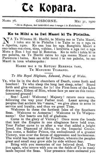 Te Kopara. NAMA 76. GISBORNE. MEI 31, 1920 "Iti te Kopara, kai takirikiri ana i runga i te Kahikatea." Ko te Mihi a te Iwi Maori ki Te Piriniha. NA Ta Wiremu H. Herihi, te Minita mo te Taha Maori i tuku atu ki te Piriniha i te Taite te 29 o nga ra o Aperira, 1920. Ko ona hoa ko nga Rangitira Maori e ono-tekau-ma-rima, täne, wähine, i kowhiria e nga iwi o nga Motu e Rua i hui mai ki Rotorua. Ko te mihi i tuhia ki te reo pakeha, na Te Herihi ratou ko nga mema Maori o te Paremata i haina. Ko te mihi tenei i te reo pakeha, he reo Maori ia tona whakaupoko: HAERE MAI E TE KOTUKU RERENGA TAHI, TE MANUHIRI TUARANGI. To His Royal Highness, Edward, Prince of Wales. YE, who lie in the dark chambers of Death, come forth and hearken! Ye who sleep the long last sleep, arise! Stand forth and give welcome, for 10! the Firstborn of the Line draws near, Eldest of Him, whose face ye saw on this twice-honoured ground! Son! Lord! Welcome! Majesty! return once more following the way your Father trod. Least among the peoples that acclaim his " mana," we give place to none in service and loyalty, and thus we greet Thee. Welcome to these the furthest Isles of the Southern Seas. Welcome to Aotearoa ! Welcome to Te Waipounamu ! Our hearts are full of gladness. Come in the glory of Victory! Once more the bonds that knit the Empire in one allegiance have held true. Your Father came to us after a war that added a bright Jewel, the Diamond of Africa, to the Imperial Crown. You come, a Soldier Prince, the embodiment of a greater Victory, won over the forces of oppression and lawlessness. The world has been saved for Freedom, wherein the peoples great and small may grow side by side without fear. Bring with you memories of our beloved dead. They live again, who strove with you on the fields of Tu in many lands beyond the Seas. Your presence there endeared you