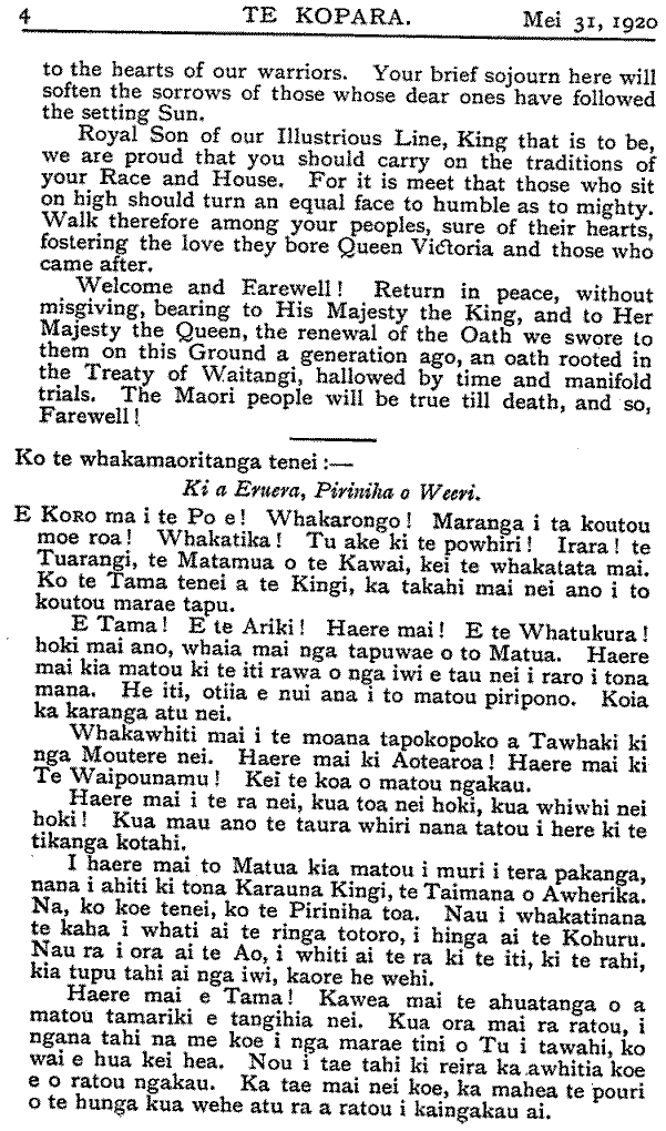 to the hearts of our warriors. Your brief sojourn here will soften the sorrows of those whose dear ones have followed the setting Sun. Royal Son of our Illustrious Line, King that is to be, we are proud that you should carry on the traditions of your Race and House. For it is meet that those who sit on high should turn an equal face to humble as to mighty. Walk therefore among your peoples, sure of their hearts, fostering the love they bore Queen Victoria and those who came after. Welcome and Farewell ! Return in peace, without misgiving, bearing to His Majesty the King, and to Her Majesty the Queen, the renewal of the Oath we swore to them on this Ground a generation ago, an oath rooted in the Treaty of Waitangi, hallowed by time and manifold trials. The Maori people will be true till death, and so, Farewell ! Ko te whakamaoritanga tenei: Ki a Eruera, Piiriniha o Weeri. E KORO ma i te Po e! Whakarongo ! Maranga i ta koutou moe roa! Whakatika! Tu ake ki te powhiri! Irara! te Tuarangi, te Matamua o te Kawai, kei te whakatata mai. Ko te Tama tenei a te Kingi, ka takahi mai nei ano i to koutou marae tapu. E Tama! E te Ariki! Haere mai! E te Whatukura! hoki mai ano, whaia mai nga tapuwae o to Matua. Haere mai kia matou ki te iti rawa o nga iwi e tau nei i raro i tona mana. He iti, otiia e nui ana i to matou piripono. Koia ka karanga atu nei. Whakawhiti mai i te moana tapokopoko a Tawhaki ki nga Moutere nei. Haere mai ki Aotearoa! Haere mai ki Te Waipounamu! Kei te koa o matou ngakau. Haere mai i te ra nei, kua toa nei hoki, kua whiwhi nei hoki! Kua mau ano te taura whiri nana tatou i here ki te tikanga kotahi. I haere mai to Matua kia matou i muri i tera pakanga, nana i ahiti ki tona Karauna Kingi, te Taimana o Awherika. Na, ko koe tenei, ko te Piriniha toa. Nau i whakatinana te kaha i whati ai te ringa totoro, i hinga ai te Kohuru. Nau ra i ora ai te Ao, i whiti ai te ra ki te iti, ki te rahi, kia tupu tahi ai nga iwi, kaore he wehi. Haere mai e Tama! Kawea mai te ahuatanga o a matou tamariki e tangihia nei. Kua ora mai ra ratou, i ngana tahi na me koe i nga marae tini o Tu i tawahi, ko wai e hua kei hea. Nou i tae tahi ki reira ka awhitia koe e o ratou ngakau. Ka tae mai nei koe, ka mahea te pouri o te hunga kua wehe atu ra a ratou i kaingakau ai.