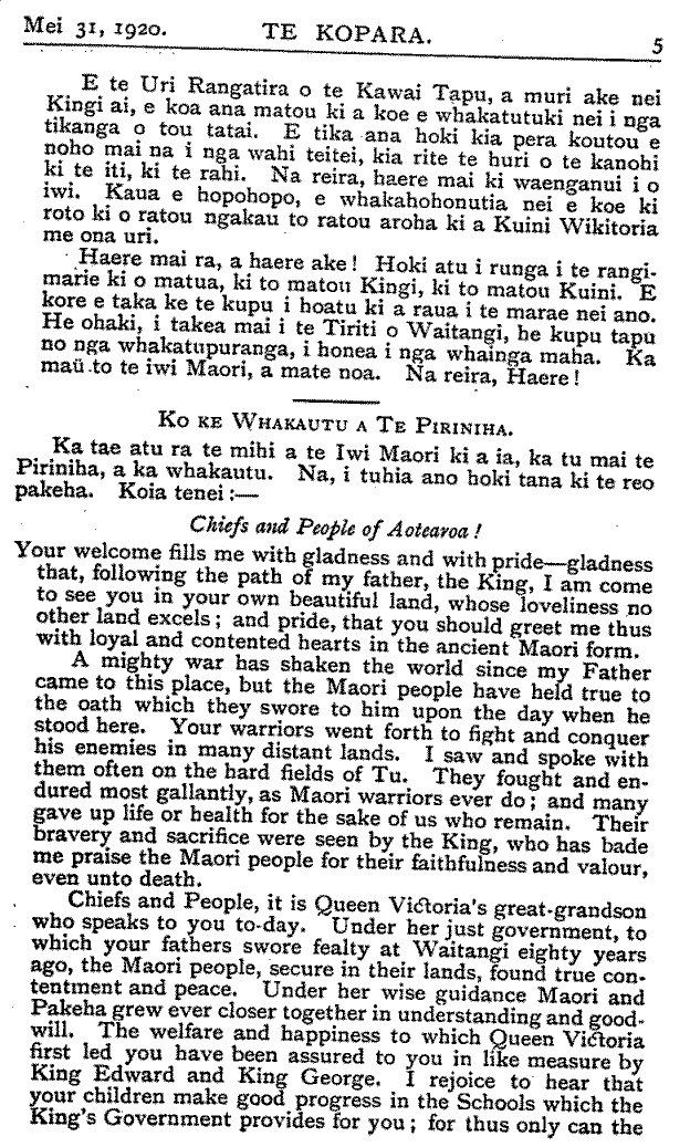 E te Uri Rangatira o te Kawai Tapu, a muri ake nei Kingi ai, e koa ana matou ki a koe e whakatutuki nei i nga tikanga o tou tatai. E tika ana hoki kia pera koutou e noho mai na i nga wahi teitei, kia rite te huri o te kanohi ki te iti, ki te rahi. Na reira, haere mai ki waenganui i o iwi. Kaua e hopohopo, e whakahohonutia nei e koe ki roto ki o ratou ngakau to ratou aroha ki a Kuini Wikitoria me ona uri. Haere mai ra, a haere ake! Hoki atu i runga i te rangimarie ki o matua, ki to matou Kingi, ki to matou Kuini. E kore e taka ke te kupu i hoatu ki a raua i te marae nei ano. He ohaki, i takea mai i te Tiriti o Waitangi, he kupu tapu no nga whakatupuranga, i honea i nga whainga maha. Ka mau to te iwi Maori, a mate noa. Na reira, Haere! KO KE WHAKAUTU A TE PIRINIHA. Ka tae atu ra te mihi a te Iwi Maori ki a ia, ka tu mai te Piriniha, a ka whakautu. Na, i tuhia ano hoki tana ki te reo pakeha. Koia tenei: Chiefs and People of Aotearoa! Your welcome fills me with gladness and with pride - gladness that, following the path of my father, the King, I am come to see you in your own beautiful land, whose loveliness no other land excels; and pride, that you should greet me thus with loyal and contented hearts in the ancient Maori form. A mighty war has shaken the world since my Father came to this place, but the Maori people have held true to the oath which they swore to him upon the day when he stood here. Your warriors went forth to fight and conquer his enemies in many distant lands. I saw and spoke with them often on the hard fields of Tu. They fought and endured most gallantly, as Maori warriors ever do; and many gave up life or health for the sake of us who remain. Their bravery and sacrifice were seen by the King, who has bade me praise the Maori people for their faithfulness and valour, even unto death. Chiefs and People, it is Queen Victoria's great - grandson who speaks to you to - day. Under her just government, to which your fathers swore fealty at Waitangi eighty years ago, the Maori people, secure in their lands, found true contentment and peace. Under her wise guidance Maori and Pakeha grew ever closer together in understanding and goodwill. The welfare and happiness to which Queen Victoria first led you have been assured to you in like measure by King Edward and King George. I rejoice to hear that your children make good progress in the Schools which the King's Government provides for you; for thus only can the