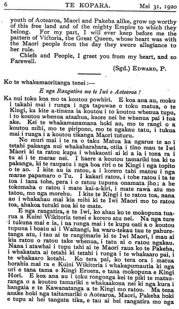 youth of Aotearoa, Maori and Pakeha alike, grow up worthy of this free land and of the mighty Empire to which they belong. For my part, I will ever keep before me the pattern of Victoria, the Great Queen, whose heart was with the Maori people from the day they swore allegiance to her rule. Chiefs and People, I greet you from my heart, and so Farewell. (Sgd.) EDWARD, P. Ko te whakamaoritanga tenei: E nga Rangatira me te Iwi o Aotearoa ! KA nui toku koa mo ta koutou powhiri. E koa ana au, moku i takahi mai i runga i nga tapuwae o toku matua, o te Kingi, ka kite a - tinana ia koutou i to koutou whenua tupu, i to koutou whenua ataahua, kaore nei he whenua pai i tua ake. Kei te whakamanamana hoki au, mo te rangi o a koutou mihi, mo te piripono, mo te ngakau tatu, i tukua mai i runga i a koutou tikanga Maori tuturu. No muri mai i te ra o taku Matua ka ngarue te ao i tetahi pakanga nui whakaharahara, otiia i tino mau te Iwi Maori ki ta ratou kupu i whakaoati ai ki a ia i tona ra i tu ai i te marae nei. I haere a koutou tamariki toa ki te pakanga, ki te raupatu i nga hoa riri o te Kingi i nga topito o te ao. I kite au ia ratou, a i korero tahi matou i nga marae papamaro o Tu. I kakari ratou, i tohe ratou i ta te toa i tana tohe, pera i o ratou tupuna onamata iho; a he tokomaha o ratou i mate kai-a-kiri, i mate rawa atu mo tatou, mo nga morehu. I kite te Kingi i to ratou toa, nana au i whakahau mai kia mihi ki te Iwi Maori mo to ratou toa, ahakoa tutuki noa ki te mate. E nga rangatira, e te Iwi, ko ahau ko te mokopuna tuarua a Kuini Wikitoria tenei e korero atu nei. Na nga ture i tukuna mai e ia, i na runga mai i te kupu oati a o koutou tupuna i hoatu ai i Waitangi, ka waru-tekau tau te pahuretanga atu, i tau ai te rangimarie ki te Iwi Maori, i mau ai kia ratou o ratou take whenua, i tatu ai o ratou ngakau. Nana i atawhai i tupu tahi ai te Maori raua ko te Pakeha, i whakatata ai tetahi ki tetahi i runga i te whakaaro pai, i te whakaaro kotahi. Ko tera pai, ko tera ora i matua horahia mai ra e Kuini Wikitoria i whakapumautia ki nga uri e tana tama e Kingi Eruera, e tana mokopuna e Kingi Hori. E koa ana au i toku rongonga kei te piki te matauranga o a koutou tamariki e whakaakona nei ki nga kura i hangaia e te Kawanatanga a te Kingi mo ratou. Ma tena anake hoki nga taitamariki o Aotearoa, Maori, Pakeha hoki e tupu ai hei tangata tika, e tau ai hei rangatira mo nga