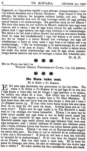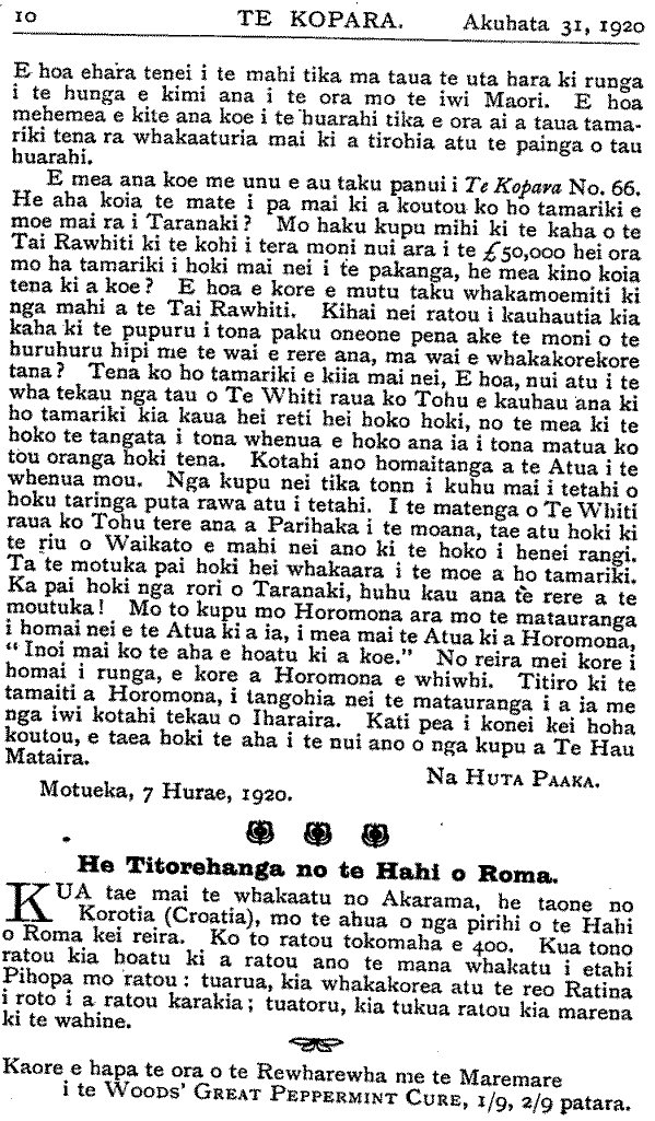 E hoa ehara tenei i te mahi tika ma taua te uta hara ki runga i te hunga e kimi ana i te ora mo te iwi Maori. E hoa mehemea e kite ana koe i te huarahi tika e ora ai a taua tamariki tena ra whakaaturia mai ki a tirohia atu te painga o tau huarahi. E mea ana koe me unu e au taku panui i Te Kopara No. 66. He aha koia te mate i pa mai ki a koutou ko ho tamariki e moe mai ra i Taranaki ? Mo haku kupu mihi ki te kaha o te Tai Rawhiti ki te kohi i tera moni nui ara i te £50,000 hei ora mo ha tamariki i hoki mai nei i te pakanga, he mea kino koia tena ki a koe ? E hoa e kore e mutu taku whakamoemiti ki nga mahi a te Tai Rawhiti. Kihai nei ratou i kauhautia kia kaha ki te pupuru i tona paku oneone pena ake te moni o te huruhuru hipi me te wai e rere ana, ma wai e whakakorekore tana ? Tena ko ho tamariki e kiia mai nei, E hoa, nui atu i te wha tekau nga tau o Te Whiti raua ko Tohu e kauhau ana ki ho tamariki kia kaua hei reti hei hoko hoki, no te mea ki te hoko te tangata i tona whenua e hoko ana ia i tona matua ko tou oranga hoki tena. Kotahi ano homaitanga a te Atua i te whenua mou. Nga kupu nei tika tonn i kuhu mai i tetahi o hoku taringa puta rawa atu i tetahi. I te matenga o Te Whiti raua ko Tohu tere ana a Parihaka i te moana, tae atu hoki ki te riu o Waikato e mahi nei ano ki te hoko i henei rangi. Ta te motuka pai hoki hei whakaara i te moe a ho tamariki. Ka pai hoki nga rori o Taranaki, huhu kau ana te rere a te moutuka! Mo to kupu mo Horomona ara mo te matauranga i homai nei e te Atua ki a ia, i mea mai te Atua ki a Horomona, "Inoi mai ko te aha e hoatu ki a koe." No reira mei kore i homai i runga, e kore a Horomona e whiwhi. Titiro ki te tamaiti a Horomona, i tangohia nei te matauranga i a ia me nga iwi kotahi tekau o Iharaira. Kati pea i konei kei hoha koutou, e taea hoki te aha i te nui ano o nga kupu a Te Hau Mataira. Na HUTA PAAKA. Motueka, 7 Hurae, 1920. He Titorehanga no te Hahi o Roma. KUA tae mai te whakaatu no Akarama, he taone no Korotia (Croatia), mo te ahua o nga pirihi o te Hahi o Roma kei reira. Ko to ratou tokomaha e 400. Kua tono ratou kia hoatu ki a ratou ano te mana whakatu i etahi Pihopa mo ratou: tuarua, kia whakakorea atu te reo Ratina i roto i a ratou karakia; tuatoru, kia tukua ratou kia marena ki te wahine. Kaore e hapa te ora o te Rewharewha me te Maremare i te WOODS' GREAT PEPPERMINT CURE, 1/9, 2/9 patara.
