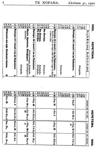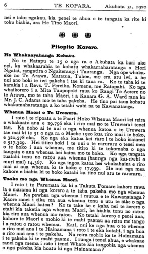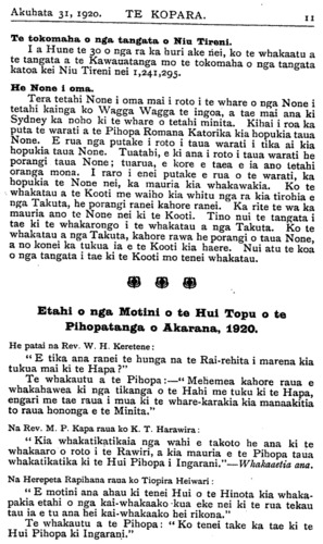 Te tokomaha o nga tangata o Niu Tireni. I a Hune te 30 o nga ra ka huri ake nei, ko te whakaatu a te tangata a te Kawauatanga mo te tokomaha o nga tangata katoa kei Niu Tireni nei 1,241,295. He None i oma. Tera tetahi None i oma mai i roto i te whare o nga None i tetahi kainga ko Wagga Wagga te ingoa a tae mai ana ki Sydney ka noho ki te whare o tetahi minita. Kihai i roa ka puta te warati a te Pihopa Romana Katorika kia hopukia taua None. E rua nga putake i roto i taua warati i tika ai kia hopukia taua None. Tuatahi, e ki ana i roto i taua warati he porangi taua None; tuarua, e kore e taea e ia ano tetahi oranga mona. I raro i enei putake e rua o te warati, ka hopukia te None nei, ka mauria kia whakawakia. Ko te whakatau a te Kooti me waiho kia whitu nga ra kia tirohia e nga Takuta, he porangi ranei kahore ranei. Ka rite te wa ka mauria ano te None nei ki te Kooti. Tino nui te tangata i tae ki te whakarongo i te whakatau a nga Takuta. Ko te whakatau a nga Takuta, kahore rawa he porangi o taua None, a no konei ka tukua ia e te Kooti kia haere. Nui atu te koa o nga tangata i tae ki te Kooti mo tenei whakatau. Etahi o nga Motini o te Hui Topu o te Pihopatanga o Akarana, 1920. He patai na Rev. W. H. Keretene: "E tika ana ranei te hunga na te Rai-rehita i marena kia tukua mai ki te Hapa ?" Te whakautu a te Pihopa: - "Mehemea kahore raua e whakahawea ki nga tikanga o te Hahi me tuku ki te Hapa, engari me tae raua i mua ki te whare-karakia kia manaakitia to raua hononga e te Minita." Na Rev. M. P. Kapa raua ko K. T. Harawira: "Kia whakatikatikaia nga wahi e takoto he ana ki te whakaaro o roto i te Rawiri, a kia mauria e te Pihopa taua whakatikatika ki te Hui Pihopa i Ingarani." - Whakaaetia ana. Na Herepeta Rapihana raua ko Tiopira Heiwari: "E motini ana ahau ki tenei Hui o te Hinota kia whakapakia etahi o nga kai-whakaako-kua eke nei ki te rua tekau tau ia e tu ana hei kaiwhakaako hei rikona." Te whakautu a te Pihopa: " Ko tenei take ka tae ki te Hui Pihopa ki Ingarani."